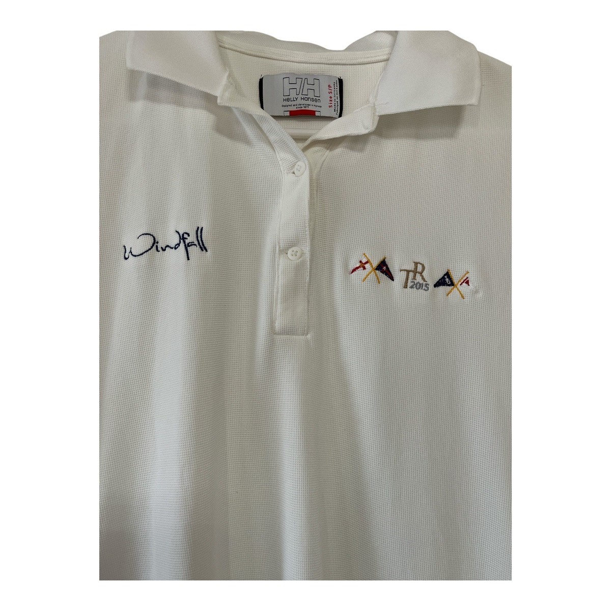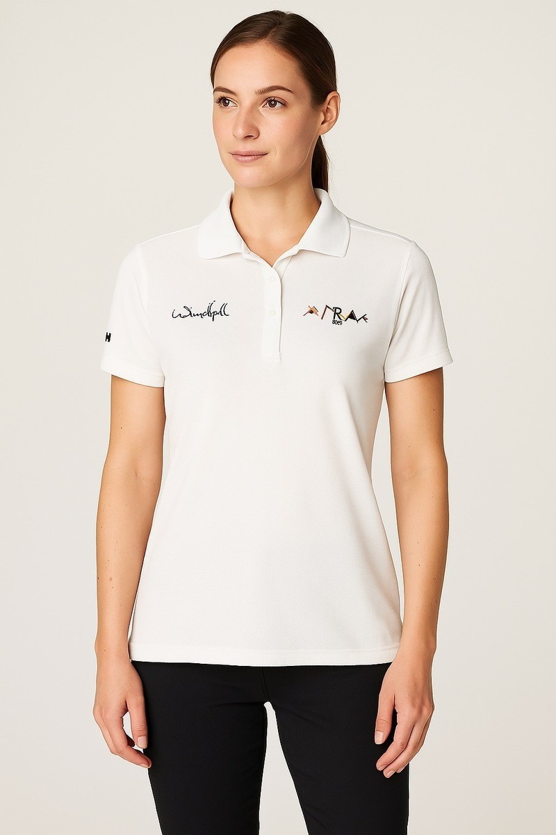 Helly Hansen women?s short sleeve polo shirt featuring ?Windfall? signature embroidery and TR 2015 regatta flag logo on the chest. Classic white design with black HH logo on the sleeve and ribbed collar. Lightweight and breathable polyamide construction, perfect for sailing, golf, or casual wear.