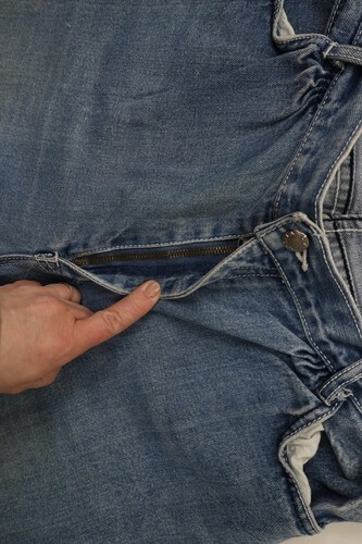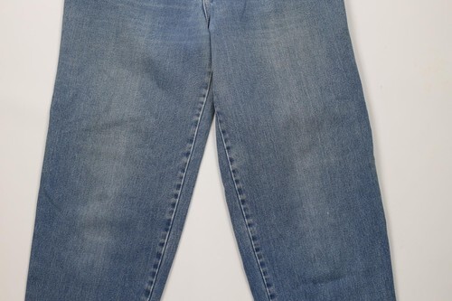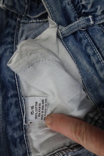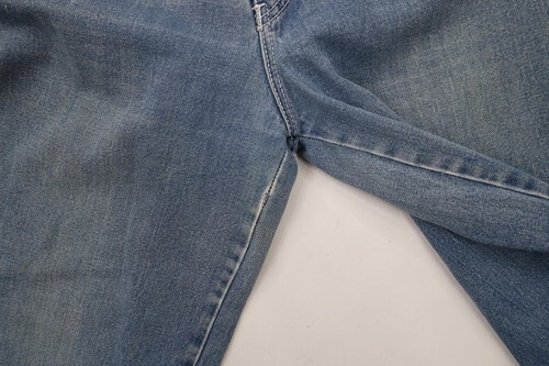 Hole inner right leg crotch area. Blemishes both legs front and back. Distressed, discolored and faded