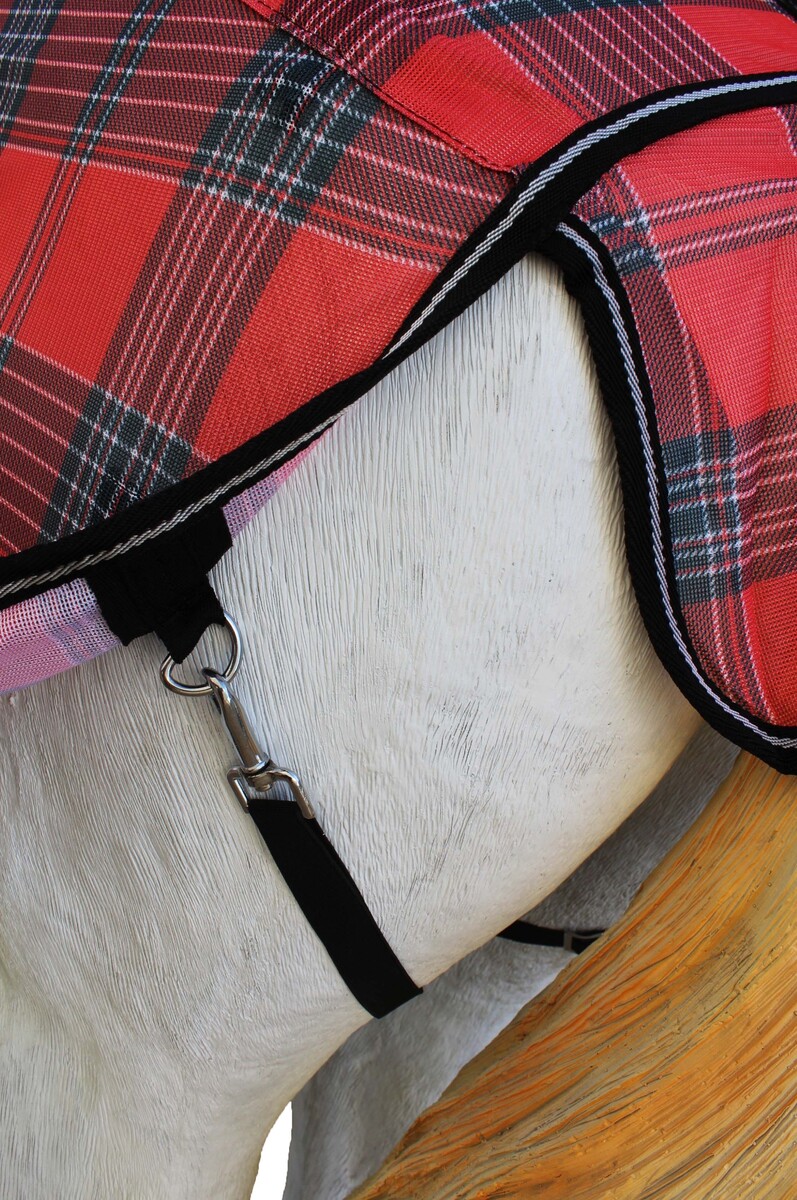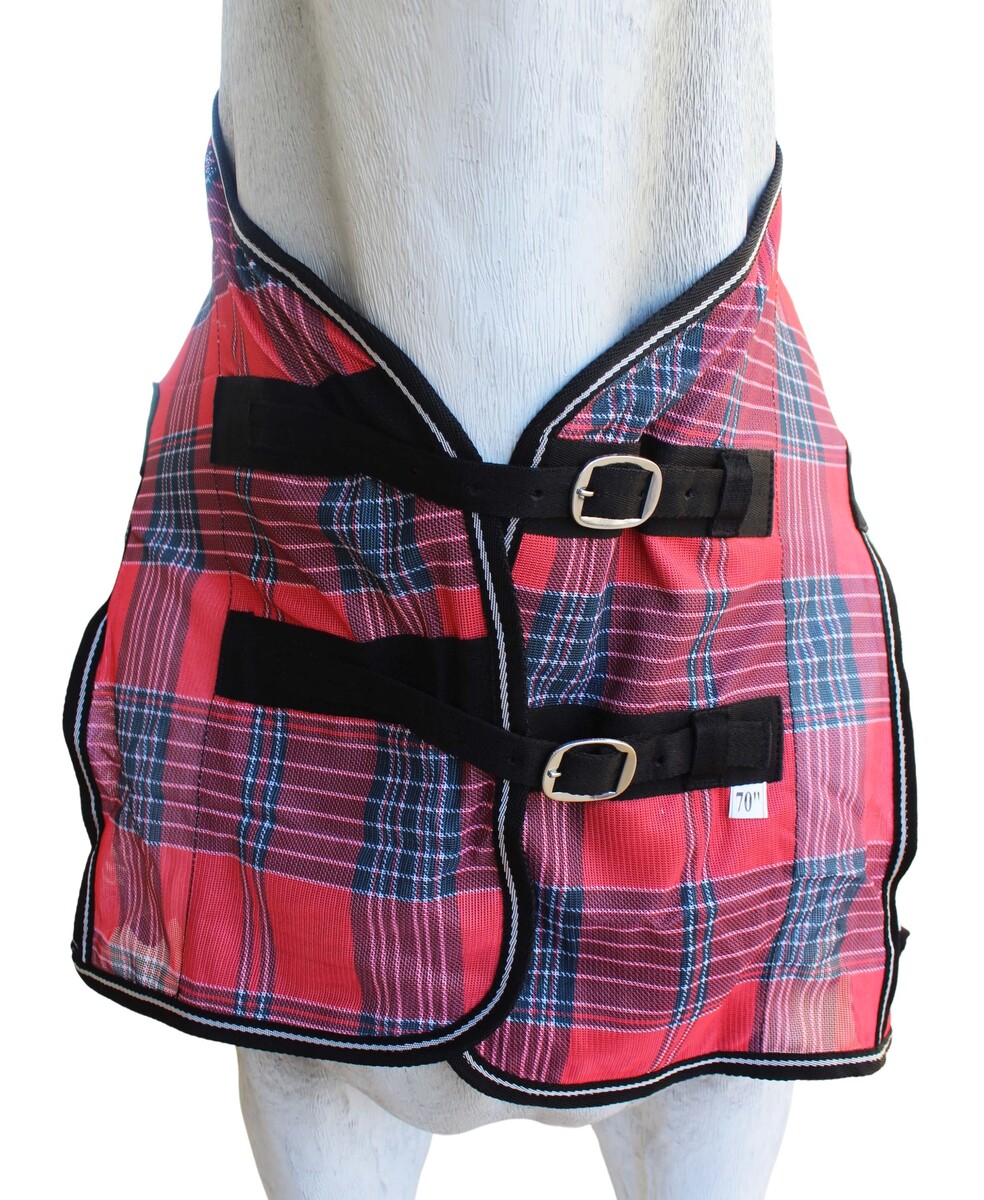 Fly sheet made from soft poly nylon mesh which allows for air circulation. Dual front buckle closure, adjustable surcingles, and elastic leg straps help secure sheet in place. Tail cover offers added protection. Shoulder gusset offers freedom of movement. Includes matching fly mask.
