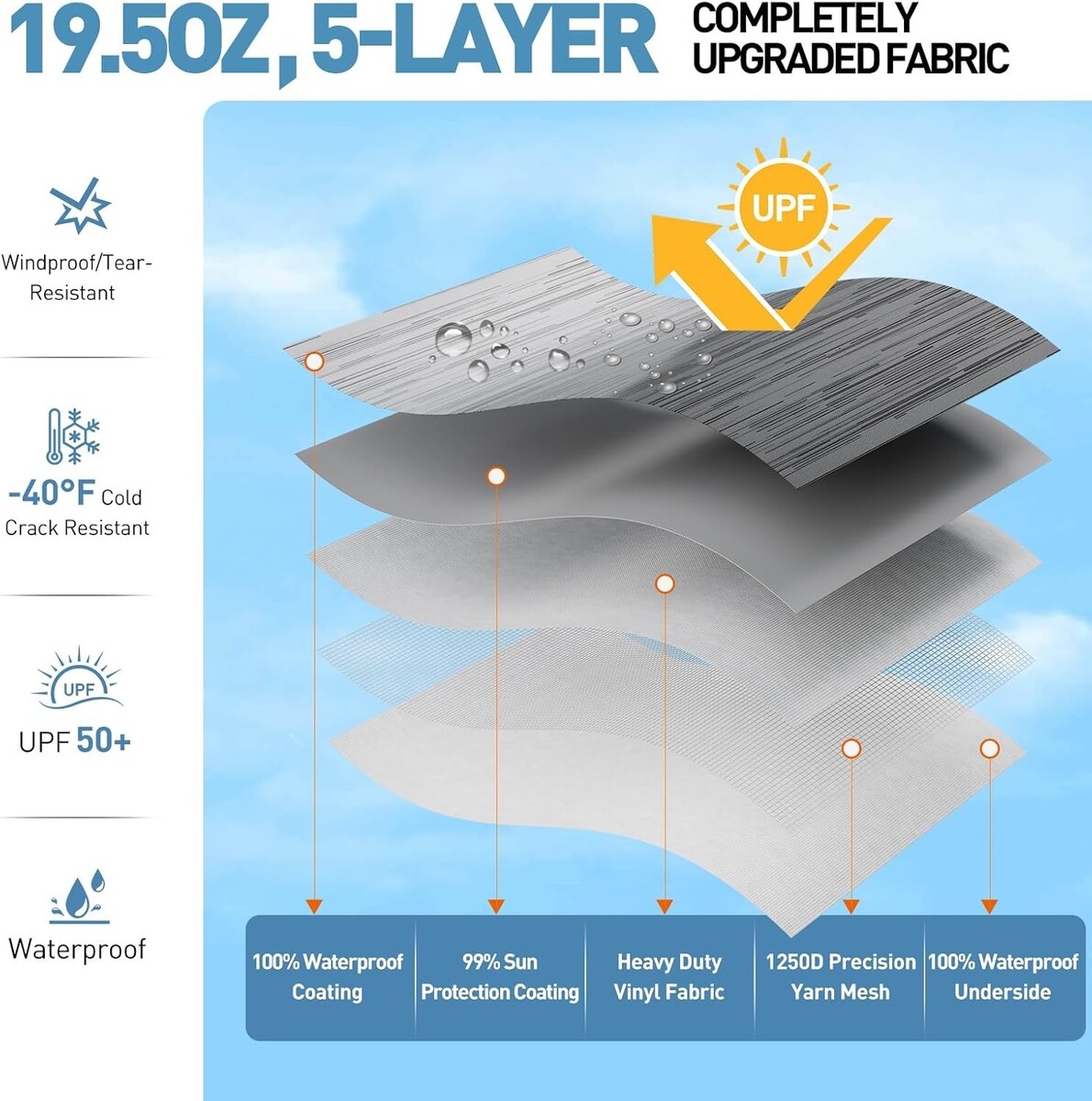 Upgraded 5-Layer Heavy-Duty Fabric: VildVandring camper awning replacement is made from 19.5oz/5-ply PVC vinyl, thicker and more tear-resistant than standard fabrics. With UPF50+ UV protection and thermal insulation, it resists cold down to -40F. ASTM-tested for quality, it features hot-pressing technology for a seamless, durable surface with no holes, giving your RV awning a fresh, long-lasting upgrade.