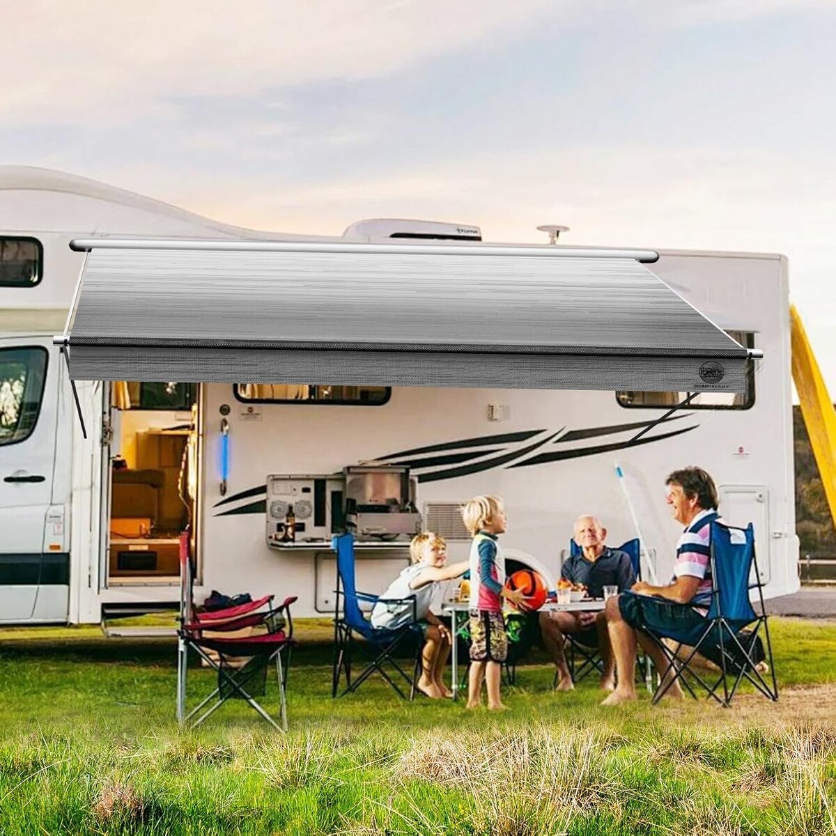 Premium Industrial-Grade RV Awning Fabric: Our RV awning fabric replacement features a double-layer, high-strength design, with a unique middle grid layer connecting both fabric layers. The grid is precisely arranged with 1.4mm spacing?much tighter and more stable than the common 3mm found in most products. This design boosts fabric strength, durability, sunshade effectiveness, and enhances wind/tear resistance, providing your RV with better protection and a longer lifespan.