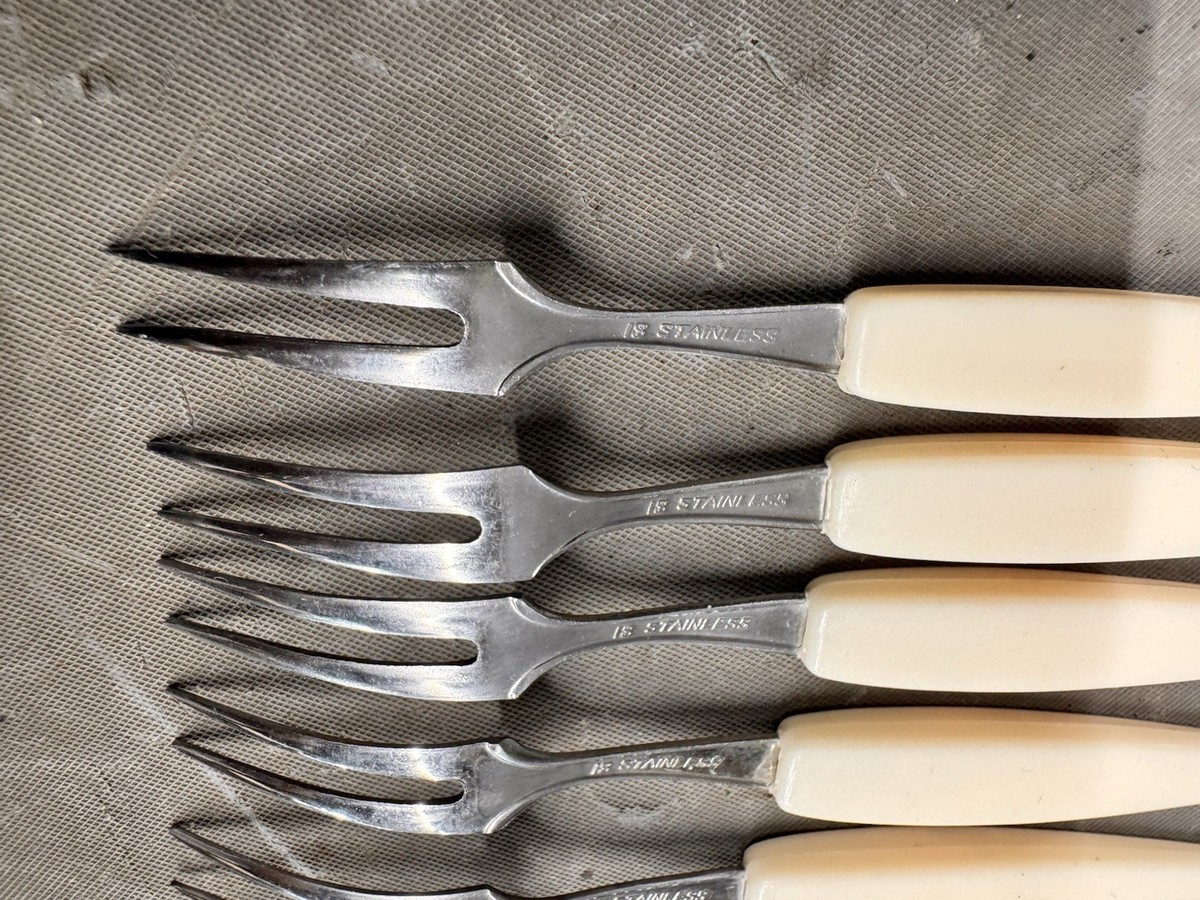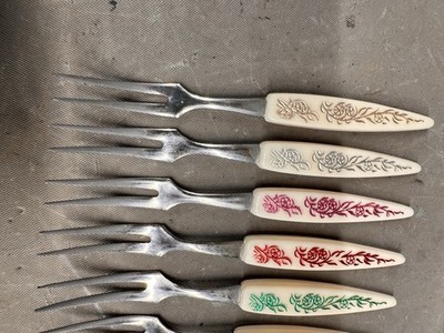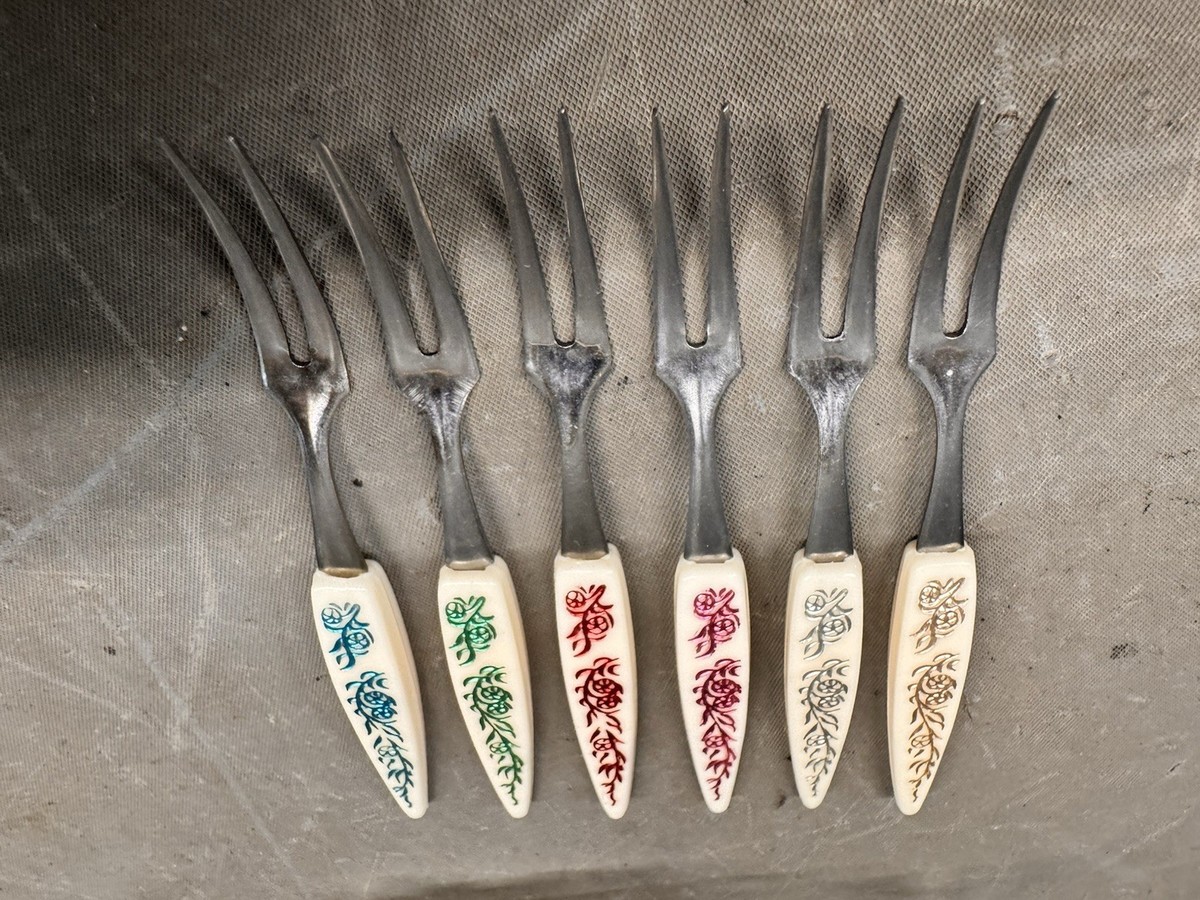 6 Vintage Mini Cocktail Appetizer Stainless Hors D'Oeuvre Plastic Handle Forks