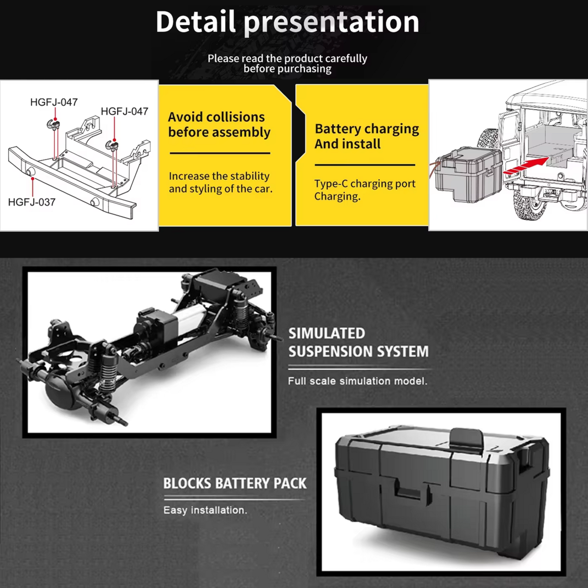 Factory description: TRASPED HG4-50 1/16 Toyota Land Cruiser FJ40 4x4 2.4G w/ Headlight RTR (Officially Licensed)