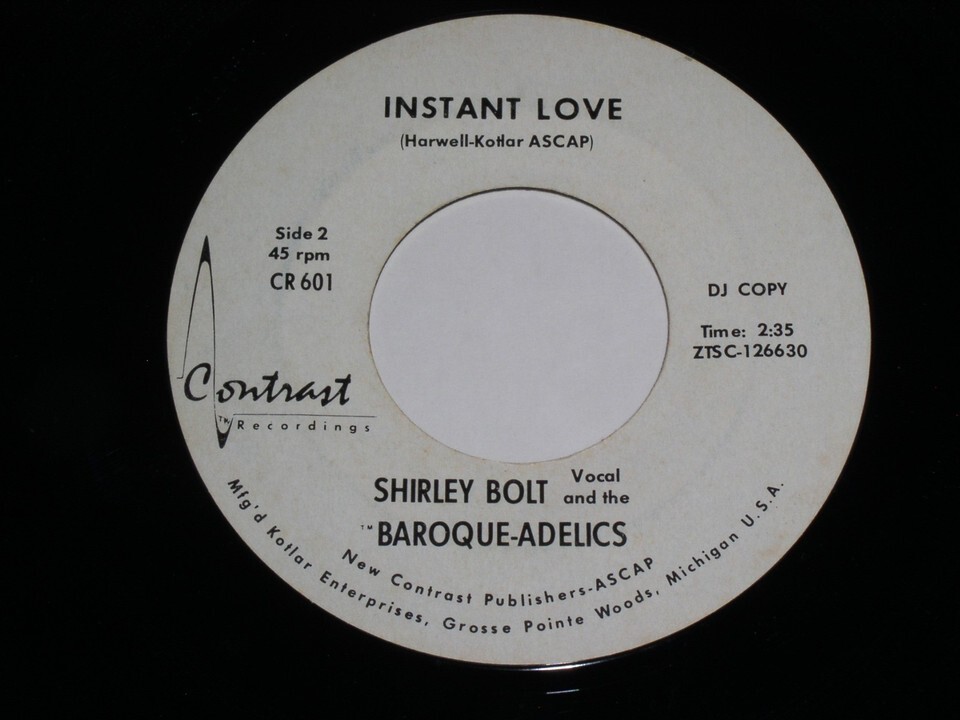 This is an original, vintage white label promotional 45 rpm phonograph record by Shirley Bolt and the Baroque-Adelics entitled, "Super Lover". Flipside: "Instant Love". Record label Contrast CR 601.