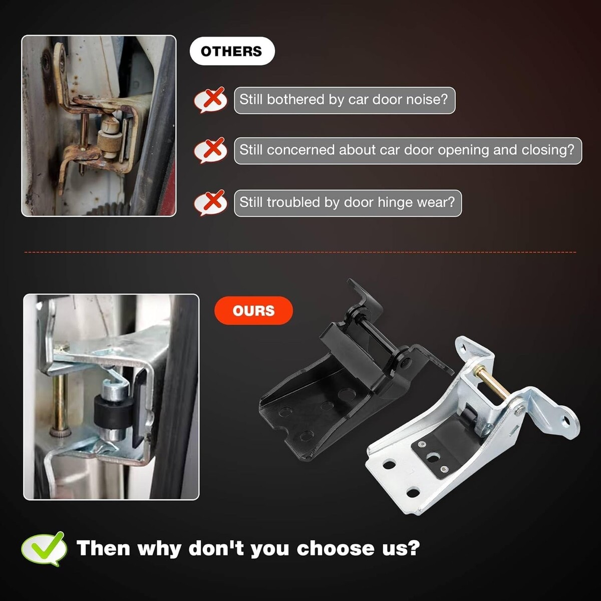 3?? Precision Engineering: Our hinges are precision-engineered for a perfect fit, ensuring smooth and reliable operation. This exact fit reduces wear and tear on your vehicle?s door and frame, extending their lifespan. Advanced bushings and bearings guarantee quiet, effortless door movement every time you enter or exit your vehicle.