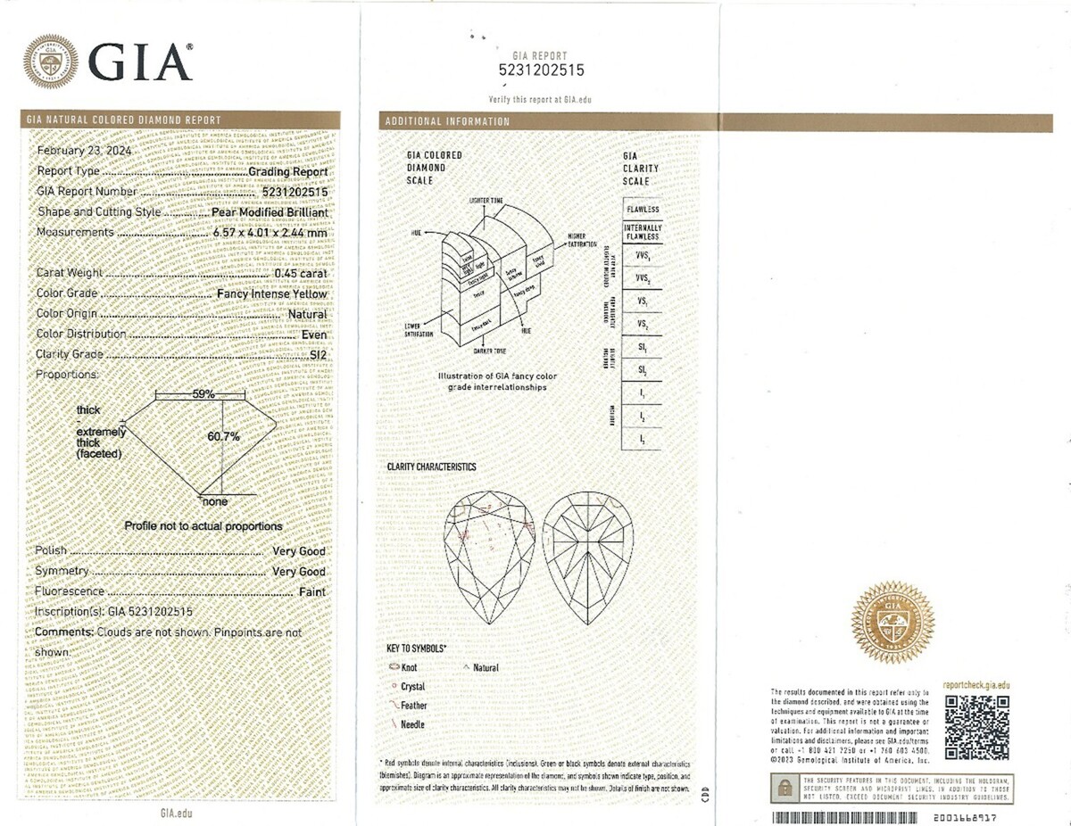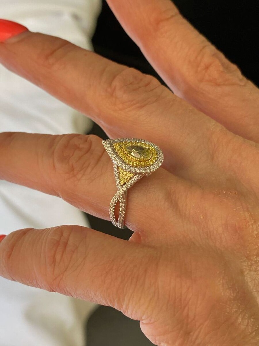 Cette bague de fiancailles est une symphonie eblouissante de diamants jaunes et incolores, sertis dans un delicat anneau en or bicolore 18 carats. Le diamant central est un diamant naturel en forme de poire jaune intense fantaisie certifie GIA de 0,45 carat, sa couleur ardente captivant l'?il sous tous les angles !!! Autour du diamant central se trouve un double halo de diamants jaunes et incolores, creant un halo de lumiere et sparkle ! Des triangles de diamants jaunes et incolores de chaque cote du diamant central ajoutent une touche de brillance supplementaire !! Cette bague est une piece vraiment unique et accrocheuse, parfaite pour la femme qui souhaite une bague de fiancailles aussi speciale qu'elle.
