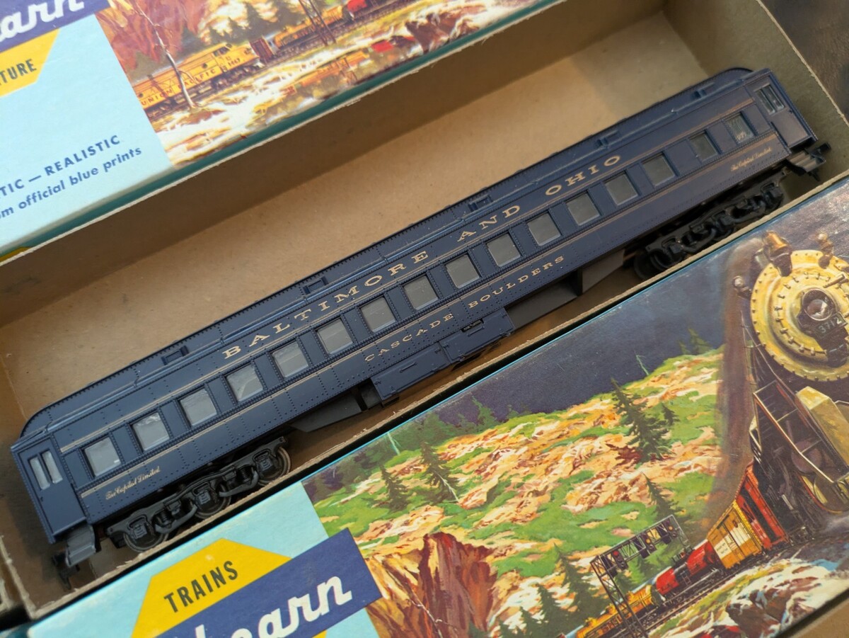 Il prodotto e un set di 6 Athearn Bev Bel Baltimore e Ohio (B O) per le autovetture in scala HO. Questi treni vintage sono pronti per andare e pre-costruiti, con una combinazione di colori verdi e dettagli dipinti. Le auto includono i nomi Capitol Garden 7001, Cascade Bluff, Boulders, Margaret Brent e RPO. Prodotti negli Stati Uniti negli anni '70, queste autovetture controllate dall'analogico sono perfette per gli appassionati di ferrovie modello che cercano di aggiungere una storia di trasporto alla loro collezione.