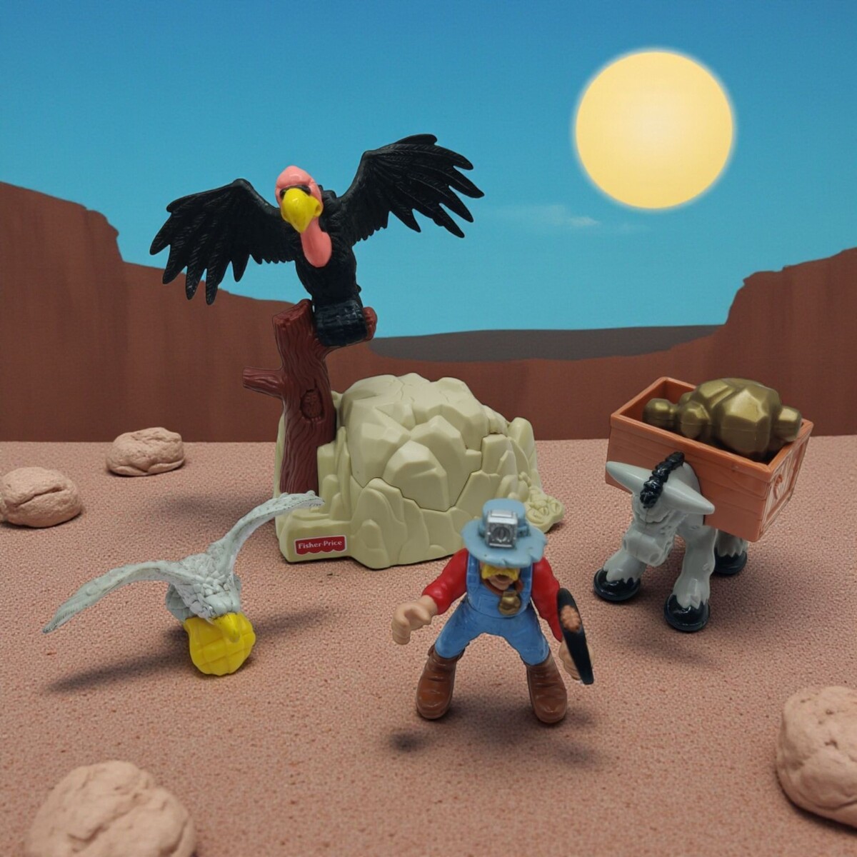 Pre-owned. Vintage Fisher Price bundle includes the rock formation, two birds, miner, gold rock, mule.
