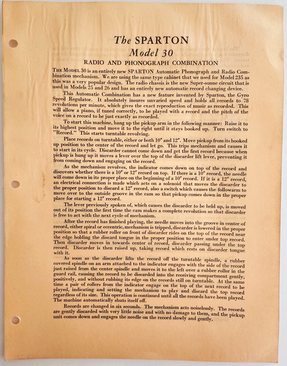 1931 Sparton Radio Phonograph Model 30 Info Advertisement Catalog Page F20B