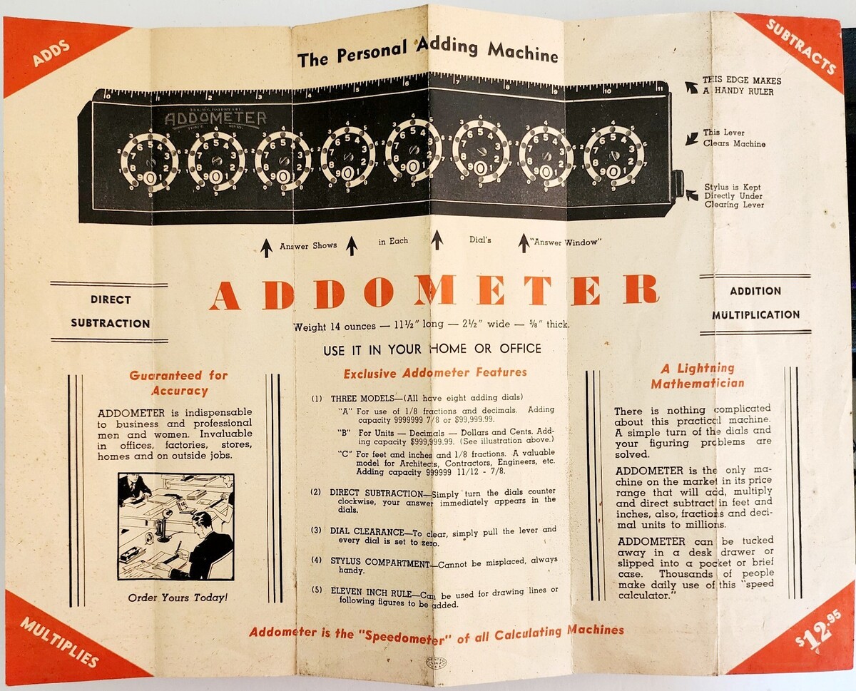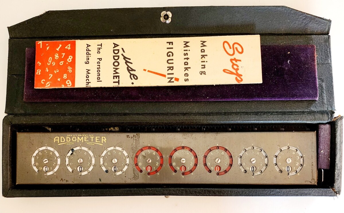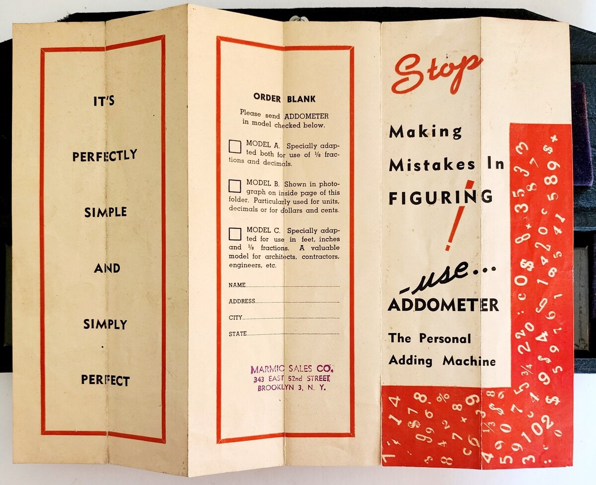 1940-50s Add-O-Meter Analog Adding Machine w/ Original Case And Brochure SBHBS