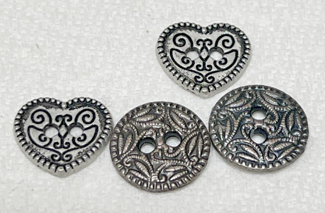 4 Silver Tone Metal Round & Hearts Buttons w Scrolly Designs 5/8 inches