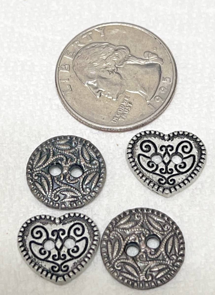 4 Silver Tone Metal Round Hearts Buttons w Scrolly Designs 5/8 inches (the hearts are 5/8 at the widest part)