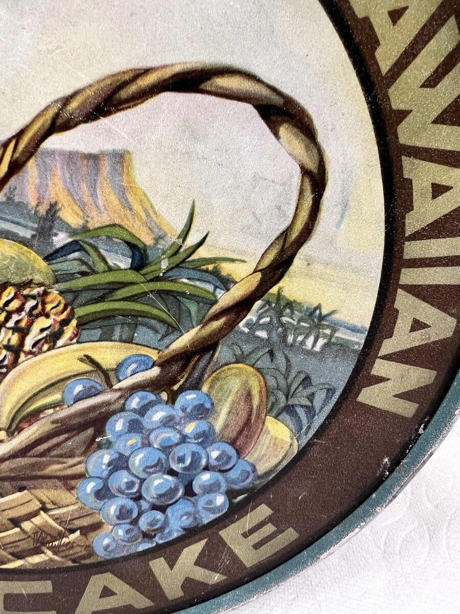 Advertising Memorabilia RARE 1927 Love's Fruit Cake Tin Honolulu Hawaii 10 3/8? wide 3 1/8 Tall a bit of paint loss / discoloring see photos and a small dent on rim