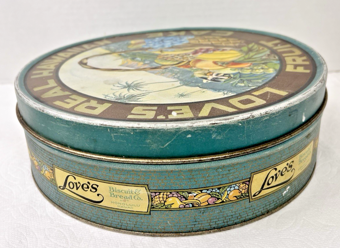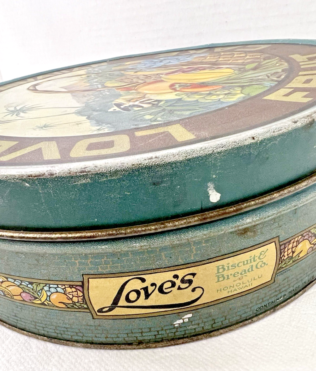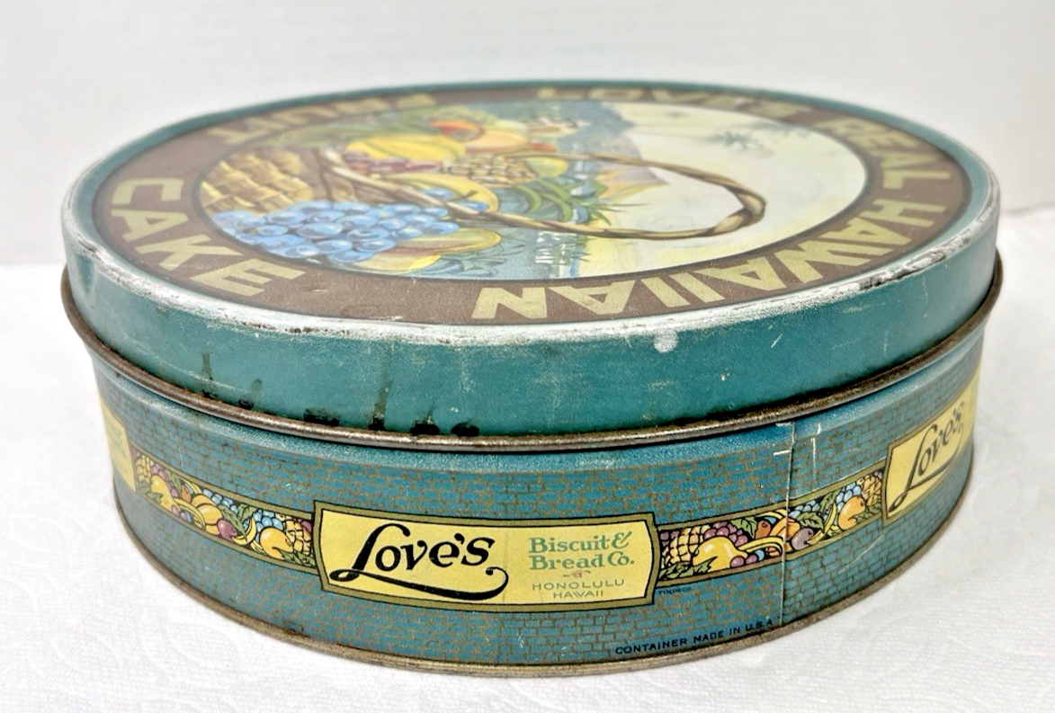 Advertising Memorabilia RARE 1927 Love's Fruit Cake Tin Honolulu Hawaii 10 3/8