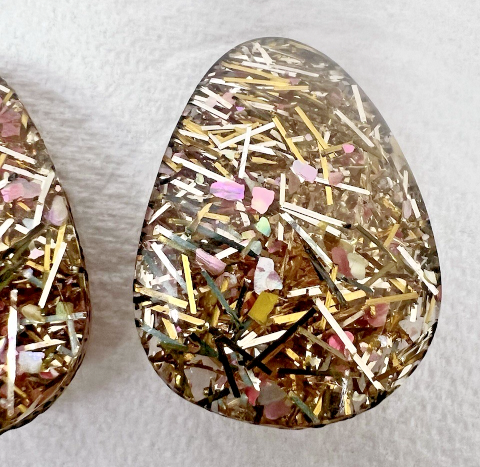 Vintage Clip Earrings Lucite w Silver Gold Pink Glitter Incased the lucite has a mix of gold and silver with a hint of pink 1 inch wide and just shy of 1 1/2 inches long