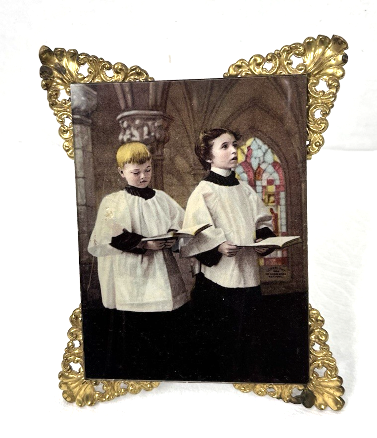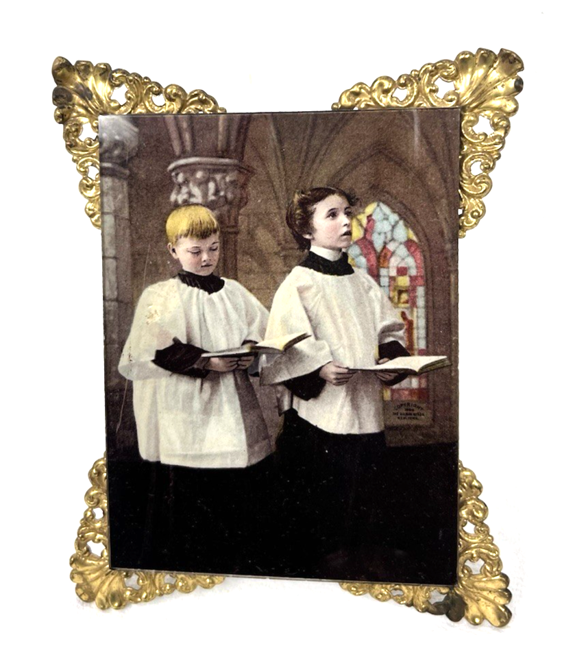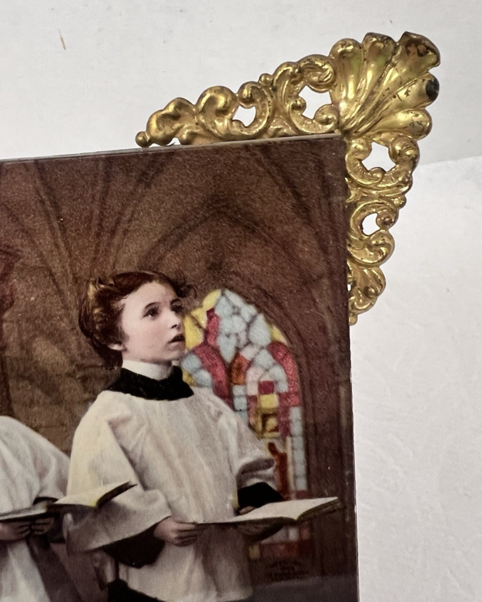 Victorian Reverse Painting Glass 2 Choir Boys w Stained Glass Gold Metal Corners