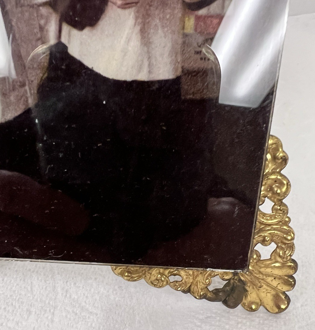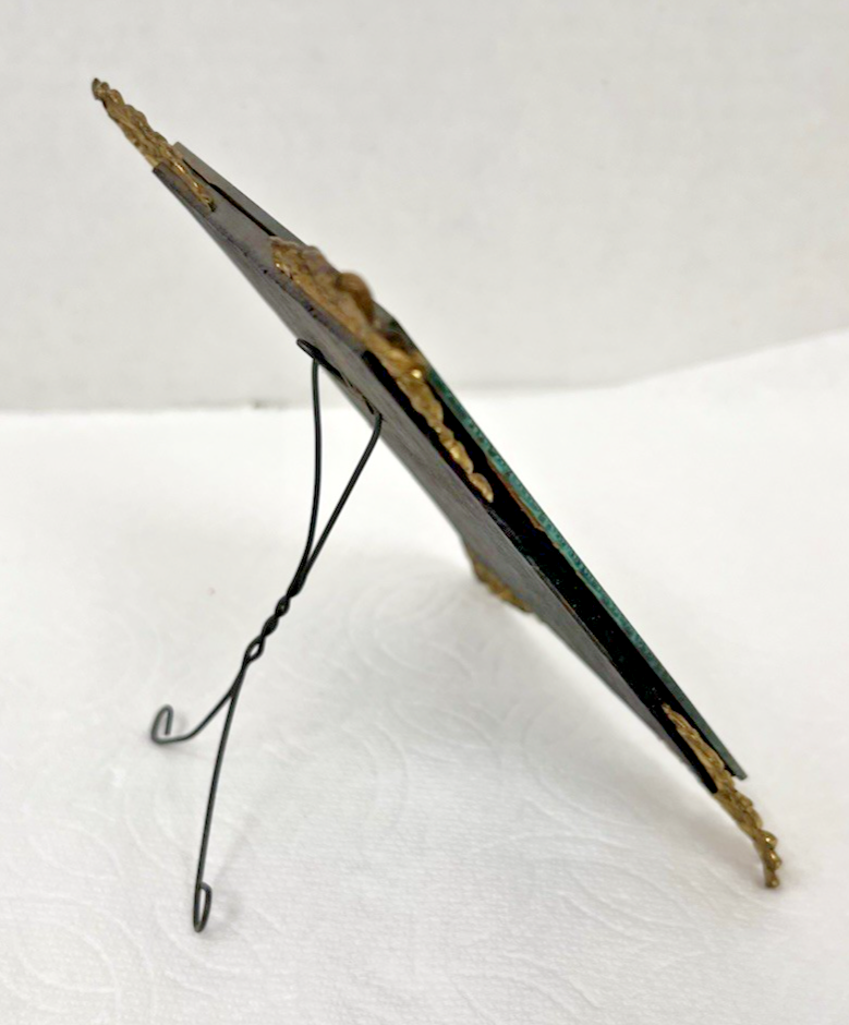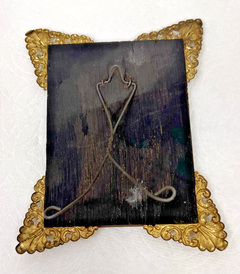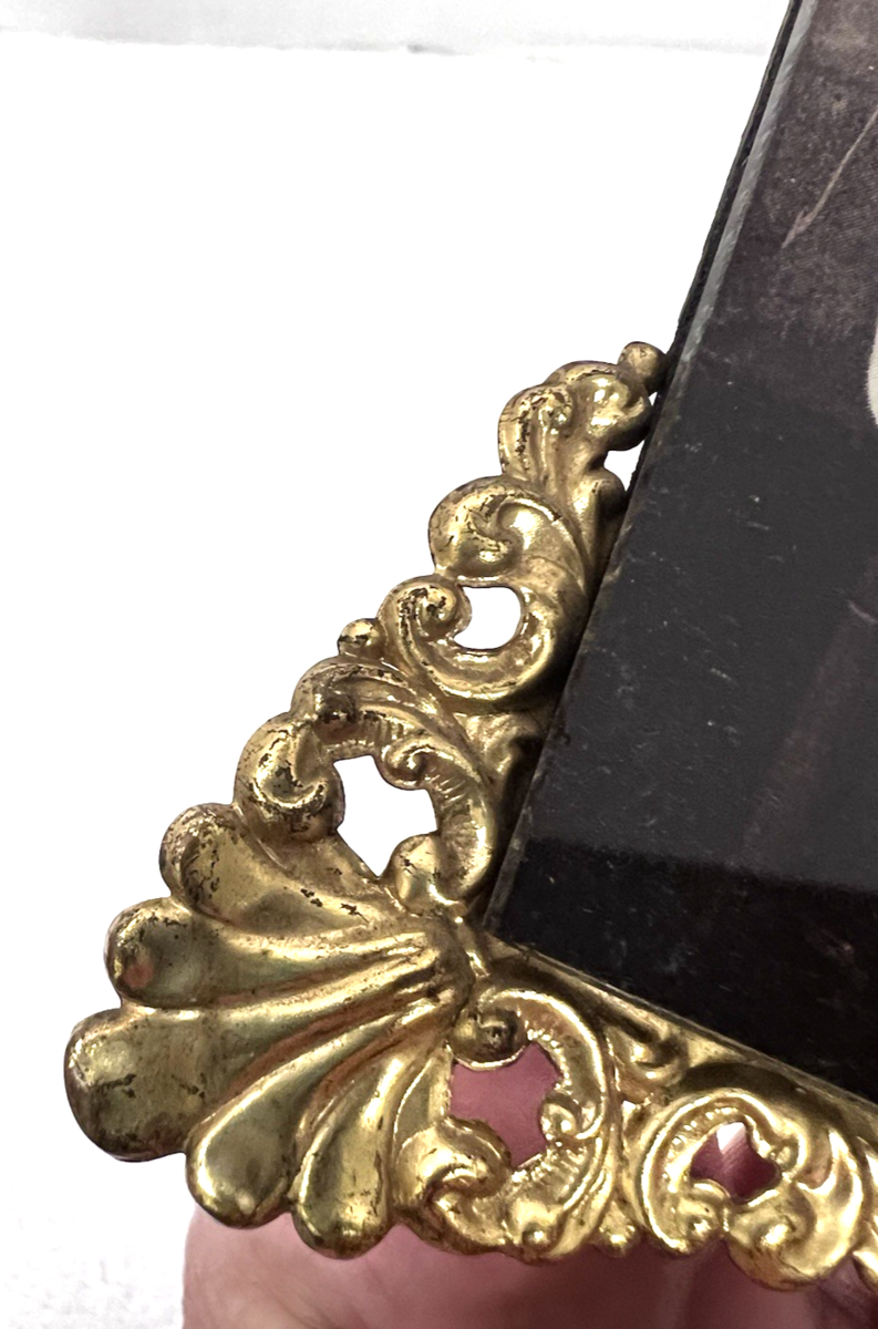 Victorian Reverse Painting Glass 2 Choir Boys w Stained Glass Gold Metal Corners The metal corners have discoloring and a few bends, but the glass is in good shape. The full measurement is 6 1/4 x 4 3/4 and the glass is 5 x 3 3/4 inches