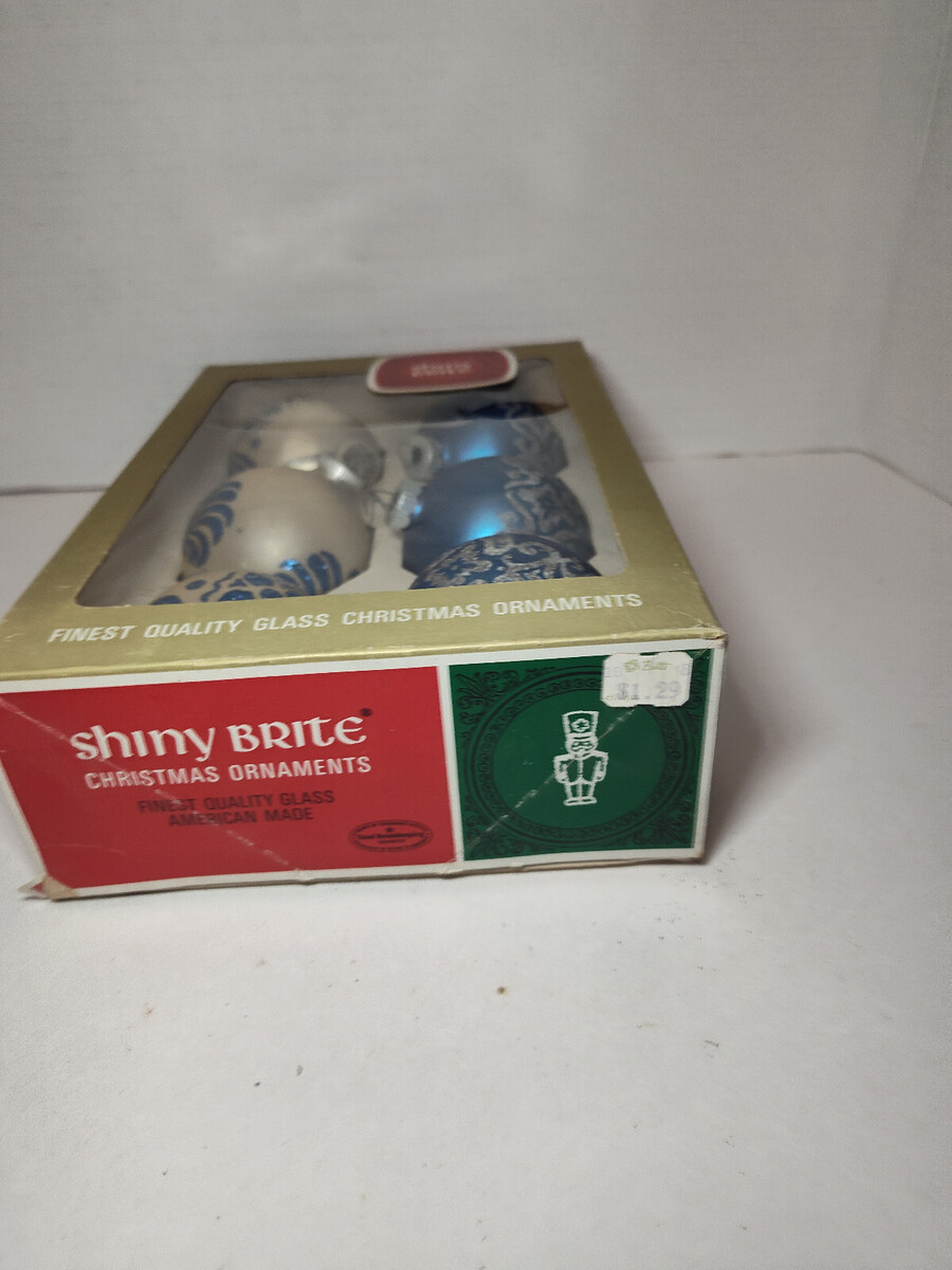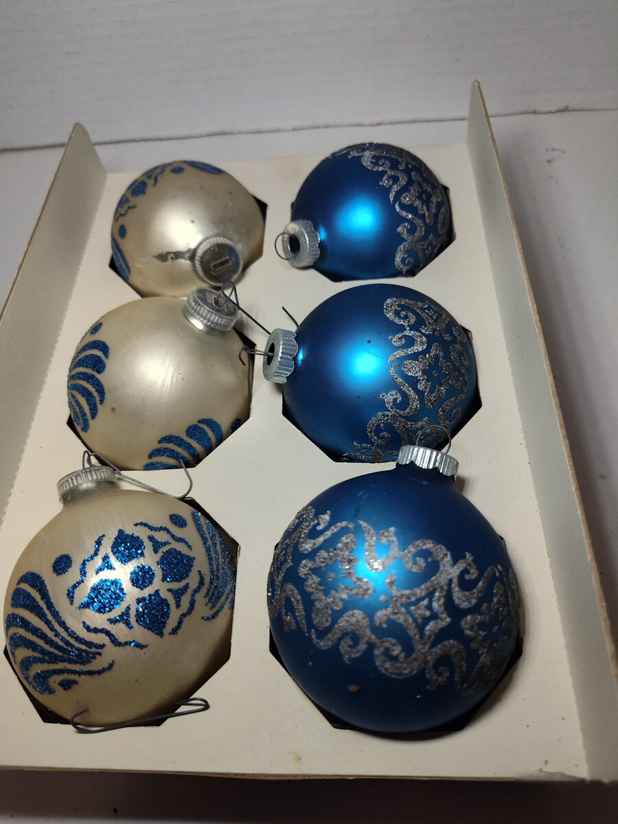 Vintage Shiny Brite Blue Silver Glitter Stencil Glass Ball Christmas Ornaments