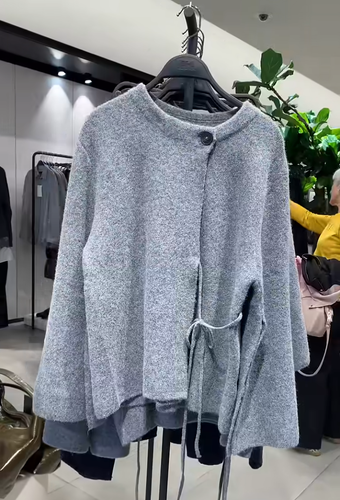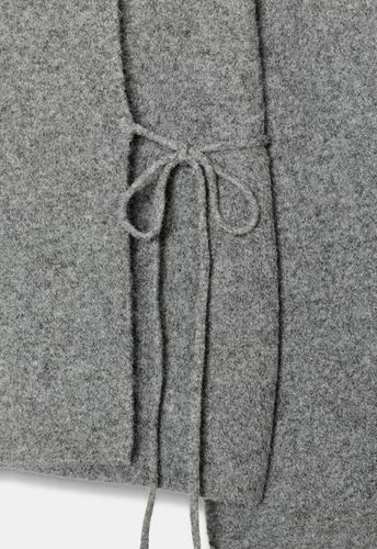 Kimono-style grey coat with a round neck and long, wide sleeves with slits. Featuring a crossover front with a tie fastening and button.
