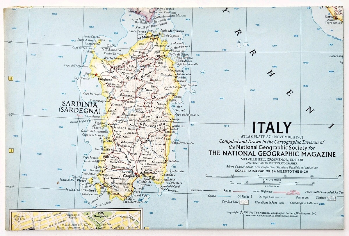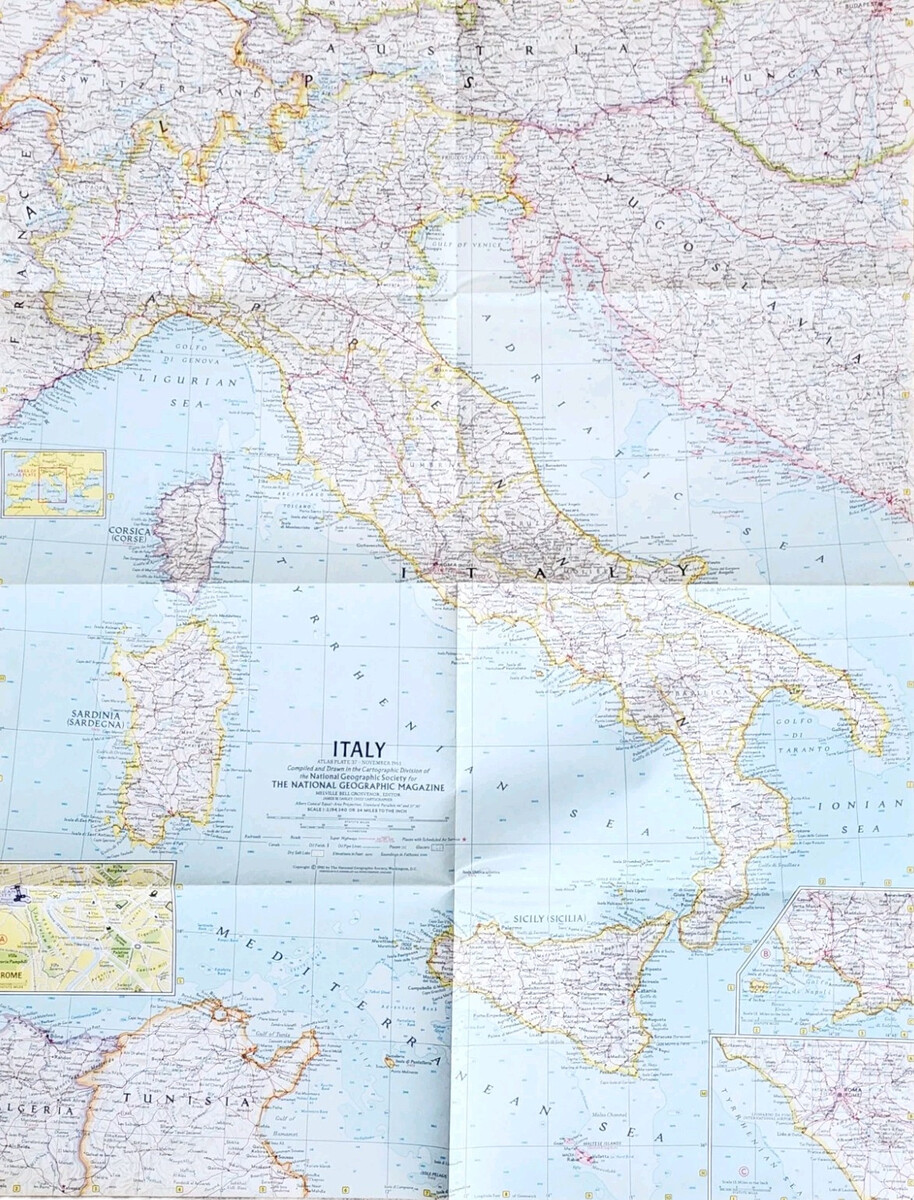 1961 Italy Map National Geographic Europe Sardinia Sicily Vtg 24.5 x 19" 2 E6A