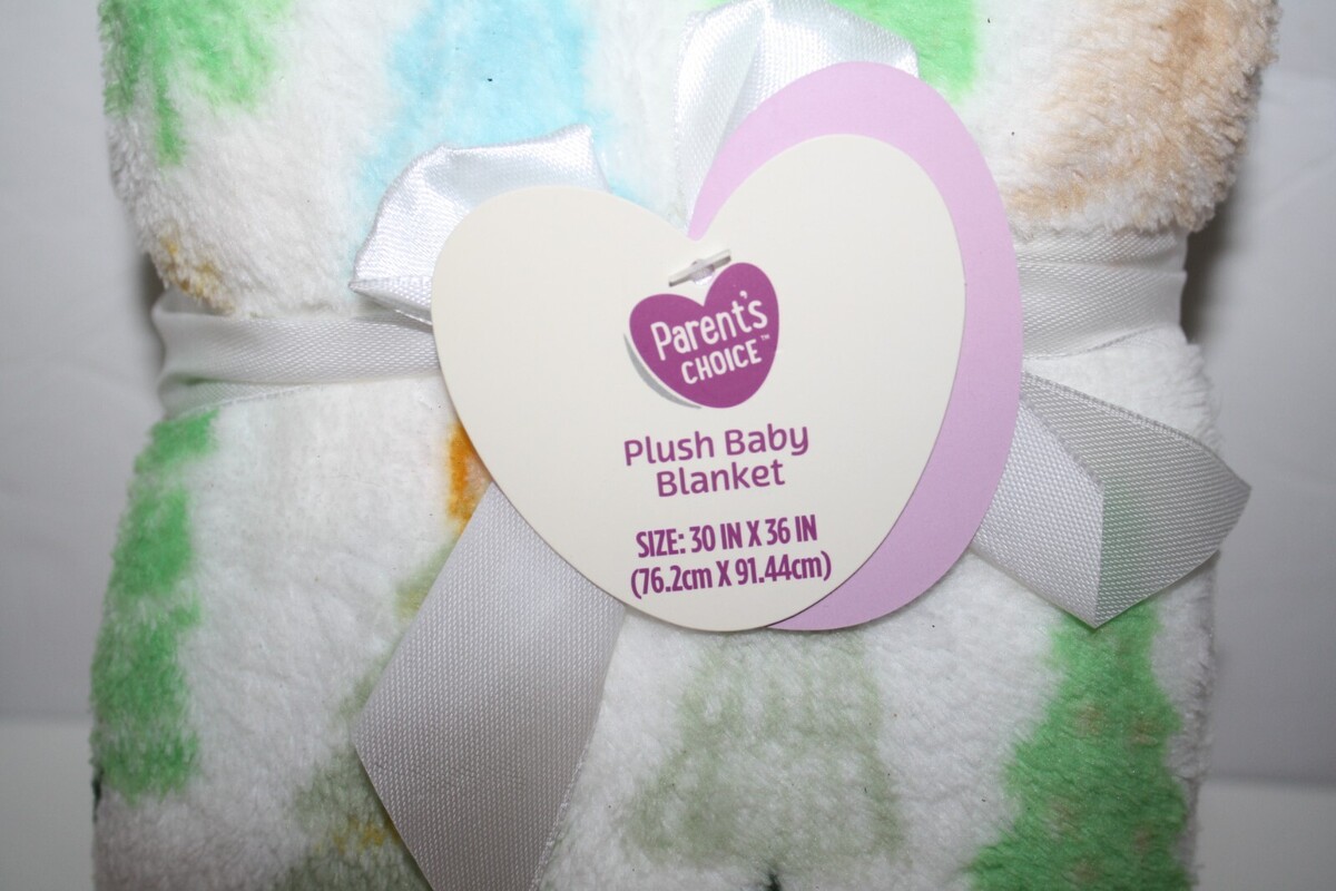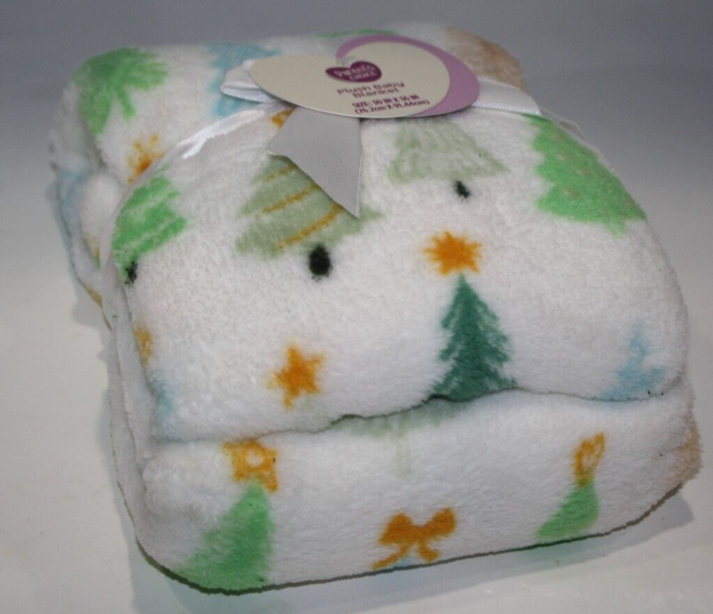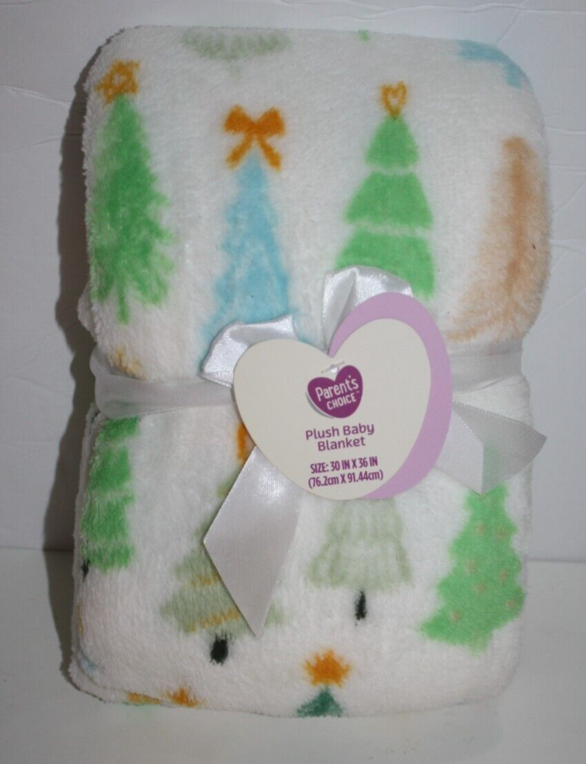 Parent's Choice, Christmas Tree Forest, Plush, Fleece, Baby Blanket, White with Green, Blue, Yellow, Lovey, New with Ribbon Bow and Paper Swing Tags, Wal-Mart, 2024 Holiday, Christmas