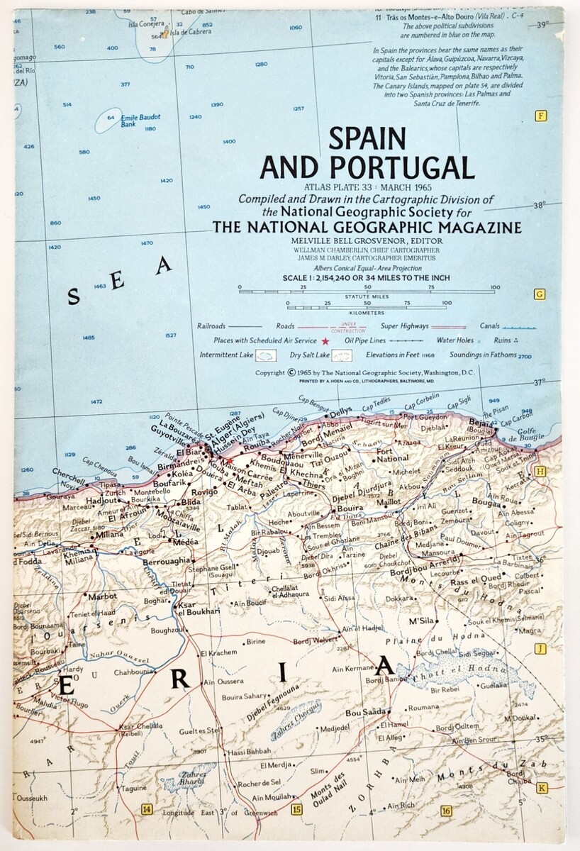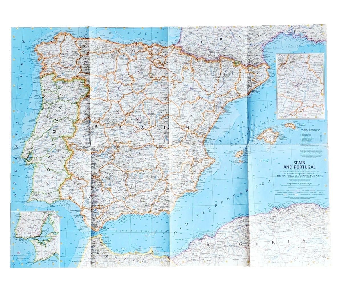 1965 Spain & Portugal Map National Geographic Vintage Europe 24.75 x 19" F13F