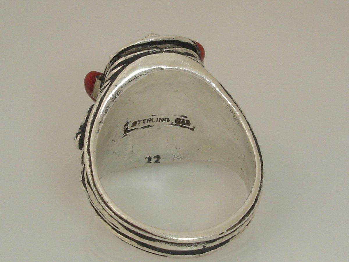 ...Tuetonic German eagle shield ring, enameled black Eagle with red claws, Brass shield top, 3-D Teutonic side helmets,Sterling Silver Oak leaves frame bottom of shield, Sterling silver worked fluted sides, and shank(bottom) HEAVYBUILT/USA