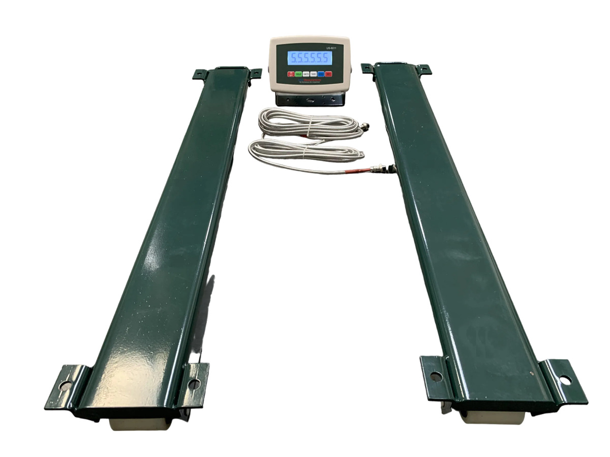 The US-ESB24-10K Easy Squeezy Weigh Bar Scale is engineered for convenience and precision, making it the ideal choice for portable weighing needs. With a 10,000 lb capacity and impressive accuracy, this scale ensures that your weighing tasks are completed with the utmost reliability. Its lightweight design and built-in handles make it easy to transport and set up, perfect for use in both industrial and agricultural settings.This weigh bar scale offers quick and seamless calibration, making it incredibly user-friendly for operators of all experience levels. The durable construction provides long-lasting performance, even in demanding environments, ensuring you get the most out of your investment. Whether you need accurate weighing for pallets, livestock, or other heavy-duty applications, the US-ESB24-10K Easy Squeezy delivers results you can count on. Weigh Bar Specifications: Sturdy top steel plate for enhanced durabilitySleek, low-profile design with a 3.5" heightQuick-disconnect connectors for fast and easy setupIntegrated carrying handles for effortless transportEquipped with portable wheels for smooth rolling of each barComes with two 15' stainless steel braided cables for secure connectionsIncludes the US-8011 indicator, pre-calibrated for accuracyHeavy-duty overload protection rated at 200% capacityUS-8011 indicator features a clear LCD displayLong-lasting rechargeable battery with up to 80 hours of operationFour adjustable leveling feet for stability on any surface10,000 lb capacity with precise 1 lb resolutionDigital indicator designed for simple and quick calibration5-year warranty on the steel frame for added peace of mind2-year warranty on electronics for reliable performanceNon-NTEP (Not legal for trade) US-8011 Indicator Features:Supports multiple weighing units: lb and kgFunctions include Gross, Tare, and ZeroingVarious hold functions for flexible weighingOverload and underload alarms for safetyPower-saving mode for extended useFully adjustable manual zero range settingAutomatic error detection and alarm systemSplash-resistant keyboard and display for added protectionCompatible with remote displaysEasily connects to USA Measurements printersDisplays up to 50,000 graduations for high precision1" LCD display with backlighting for easy readabilityIncludes mounting bracket and hardwareOperates with a 110V AC adapter (included)Full Duplex RS-232 serial port for communicationCapable of driving up to 6 load cells at 350? each What is include: (2) 24?x4? Carbon Steel Weigh Bars(4) Shear Beam Alloy Steel Load Cells(4) Adjustable Leveling Feet(2) 15? Steel Braided Home Run Braided Cable(1) Painted Steel Mounting Bracket(1) US-8011 LCD Indicator(1) 110V Power Adapter(1) User Manual Common Applications: Mounted Under Squeeze ChutesAttach a Platform to the Top of the ScaleWeighing: pigs, goats, sheep, steers, cows, cattleWeighing Pallets, Containers, Drums, Odd Size ItemsGreat for Portable Applications Weighing on the go Resources: US-ESB24-10K BrochureUS-8011 BrochureUS-8011 Owners Manual https://youtu.be/jrwEpL0eGCM?si=FTptdix_7y-59Z3g