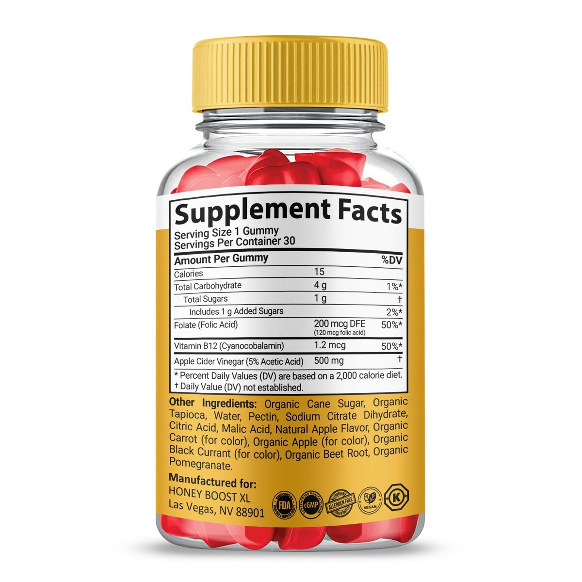 HoneyBoost XL brings the goods in a simple gummy built just for guys. Inside every delicious bite, you?ll find Apple Cider Vinegar plus Vitamin B12 and Folic Acid, all in a formula made for everyday performance. Made with all natural ingredients.