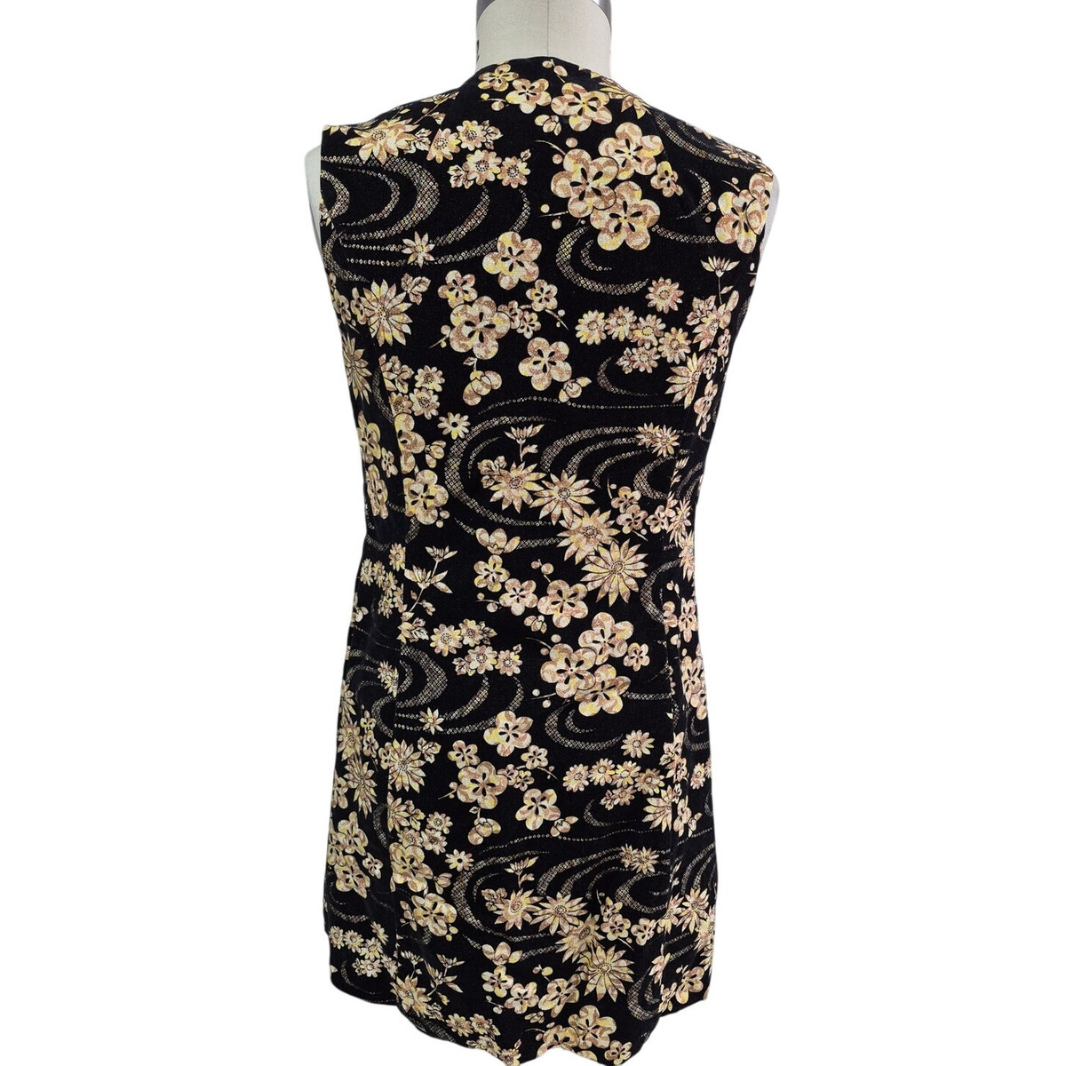 Vtg 70s Black Velvet Flocked Glitter Floral Tunic Open Vest Fully Lined XS
