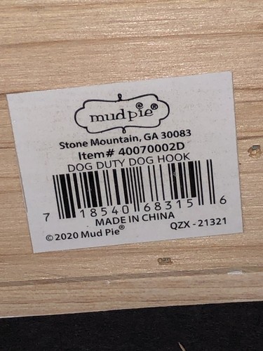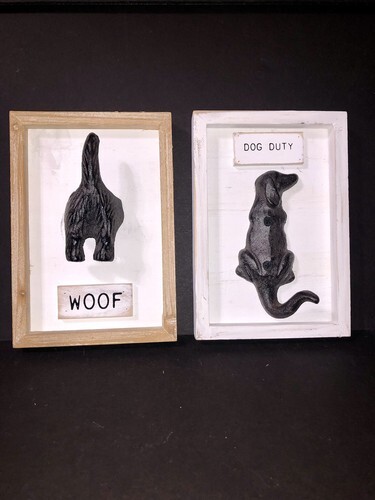 The Mud Pie Dog Tail Leash Holder Iron Hook Wall Decor is a charming and whimsical addition to any dog lover's home. This 8?x5.5 wall plaque features a humorous design of a dog tail and leash holder, perfect for adding a touch of fun to your space. Made from a combination of metal and wood, this wall decor is durable and stylish. The pre-drilled holes make it easy to hang on your wall. One says Woof and the other days Dog Duty.