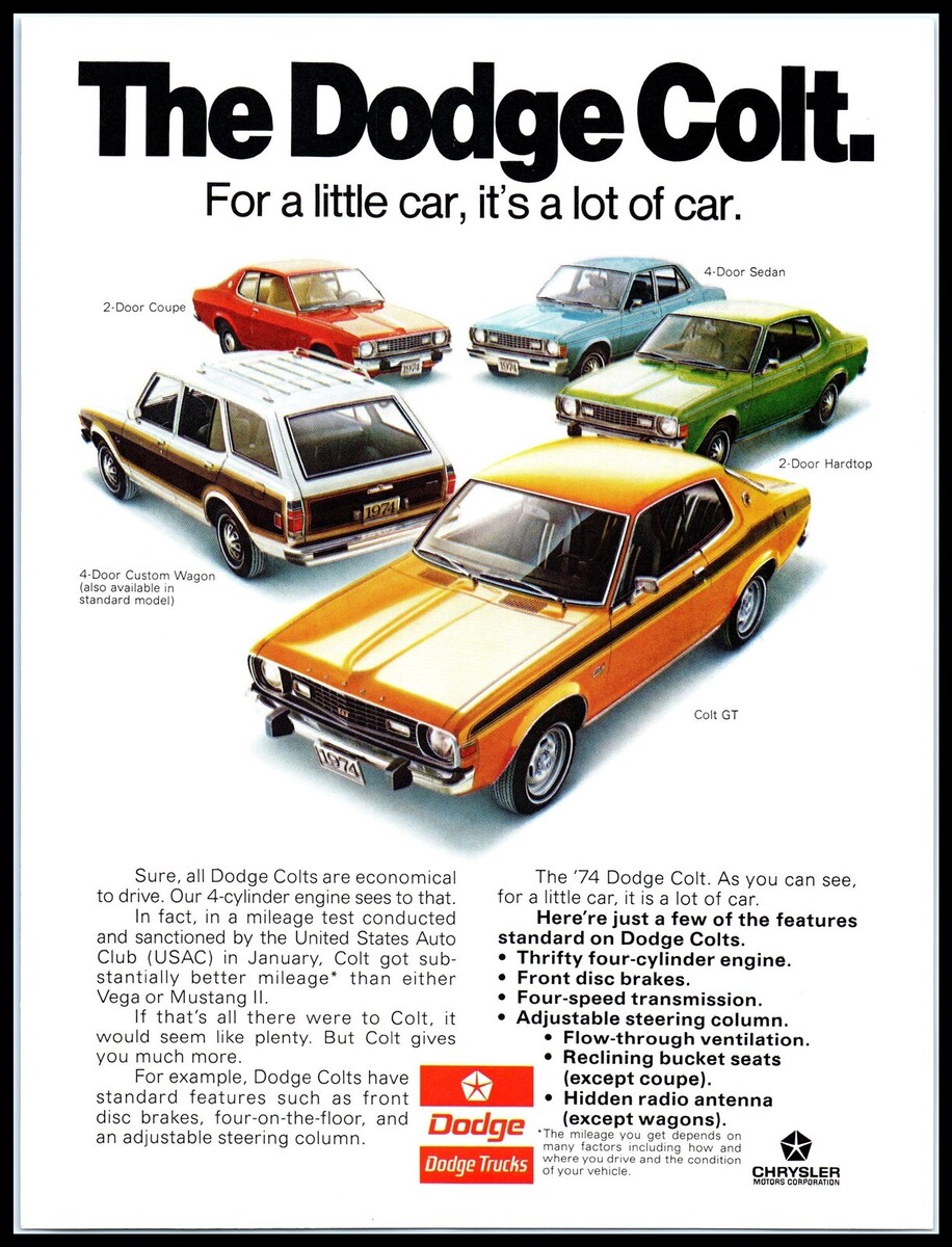 1974 Magazine Car Print Ad - DODGE, "Colt" GT, Coupe, Wagon, Sedan, Hardtop A7
