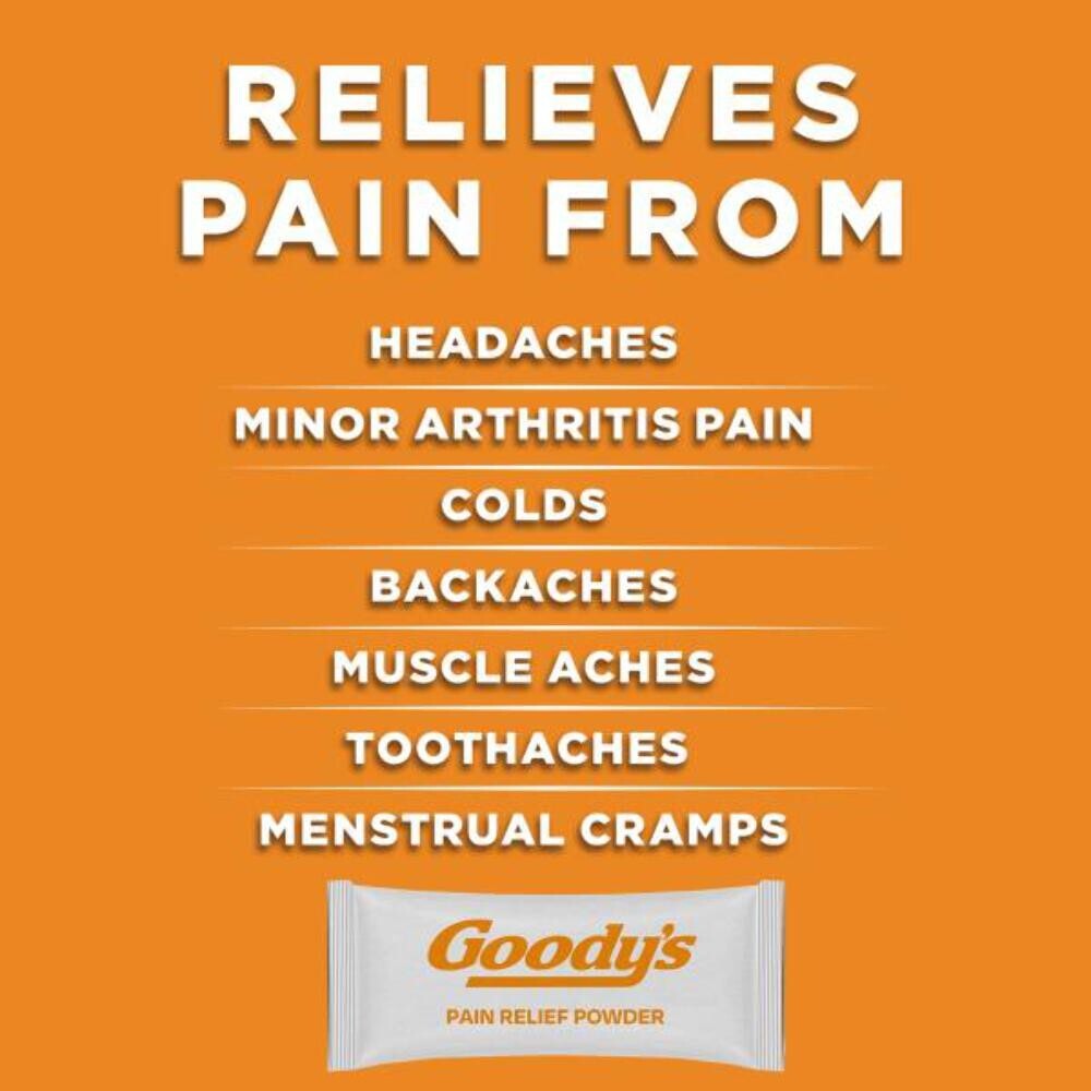 Expiration Date of 12/2026 ? Goody?s Headache Powder formula works fast to relieve aches and pains with more active ingredients per stick vs Tylenol Dissolve Packs ? Triple action pain relief, with 325 mg acetaminophen, 500 mg aspirin (NSAID) and 65 mg caffeine; strong headache pain relief without a prescription ? Cool Orange flavored, over-the-counter medication powder comes in convenient, on-the-go stick packs; One pack is one dose ? Headache relief packets are individually wrapped, making them ideal for travel medicine kits ? Contains 1 box of Goody?s Cool Orange Headache Powder, 24 stick powders; for use by adults and children 12 years and older