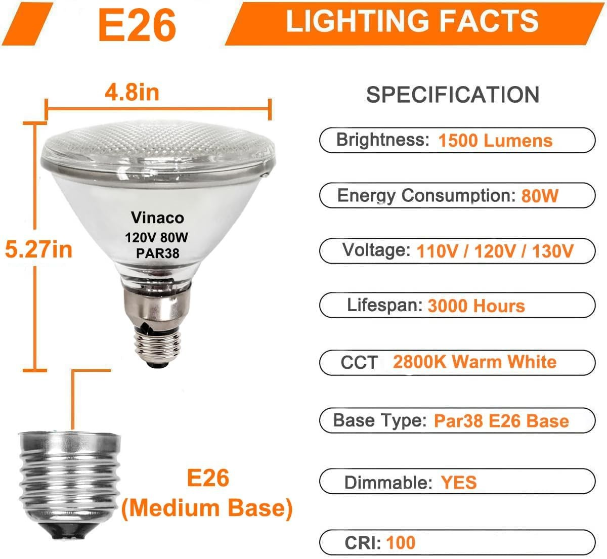 3,?PAR38 Dimmable Eye-Protective?: 80w par38 bulb, seamless dimming capability (10% - 100%) suitable for any atmosphere or decoration. Vinaco par38 outdoor bulb contain no lead or mercury, Zero Flickering, protect your eyes and care your family. no hazardous emissions, no UV or IR radiation, perfect light source for environmental protection.