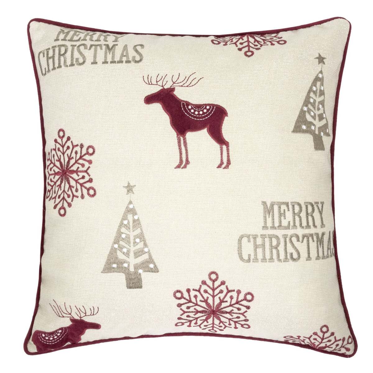 Features festive ?Merry Christmas? text with embroidered reindeer, snowflakes, and trees
