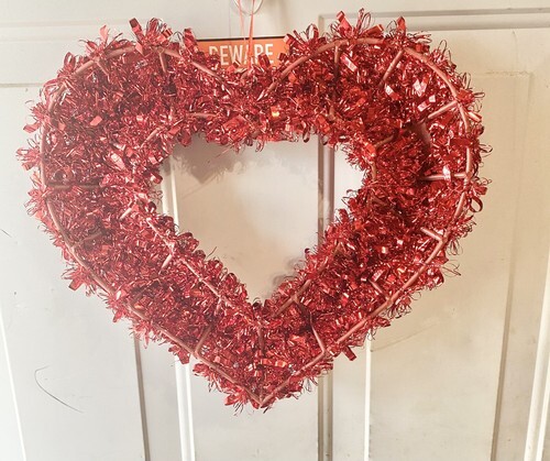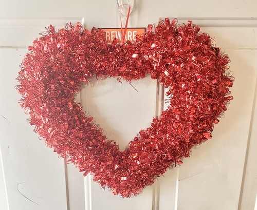 Red Tinsel Heart Shaped Valentines Day Wreath Hanging Wall or Door Decoration