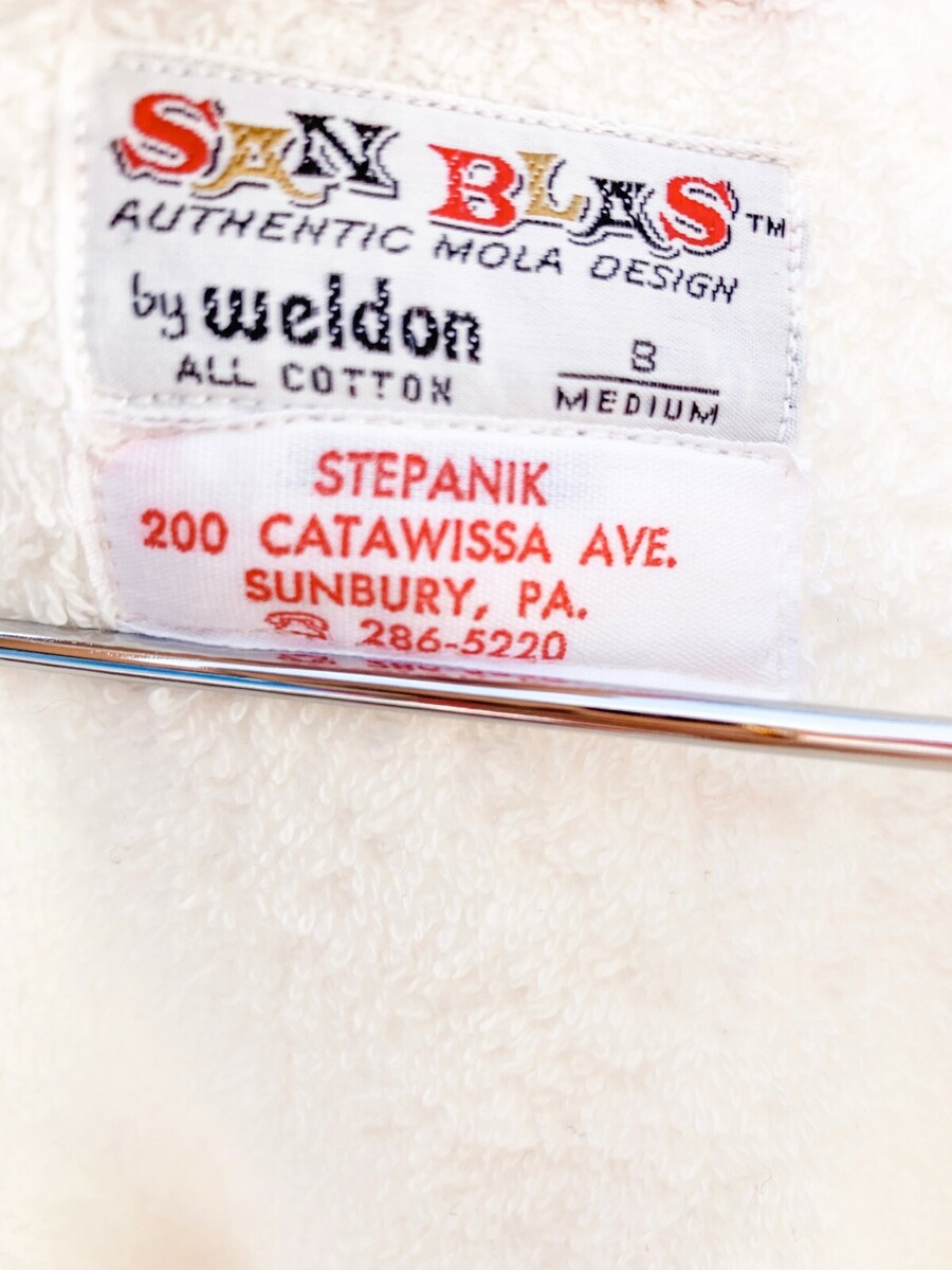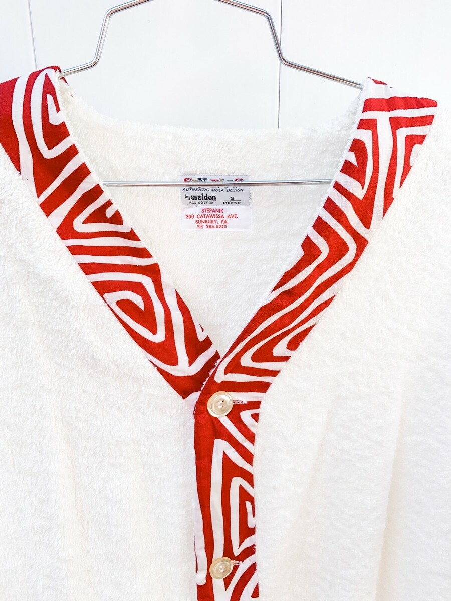 Fabric / Materials: White cotton terry cloth body; hand-stitched mola applique panels on collar and pockets.