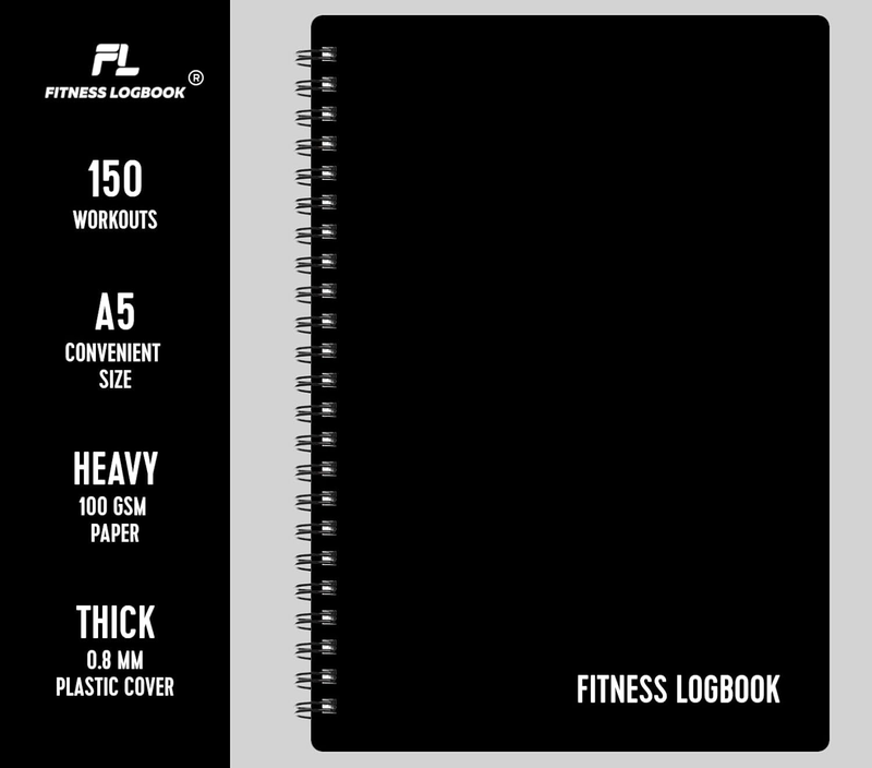 Fitness Logbook (Black) - A5 Undated Workout Journal for Men Women - Plastic Cover Thick Paper - Planner Log Book to Track Weight Loss, Muscle Gain, Gym Exercise, Bodybuilding Progress