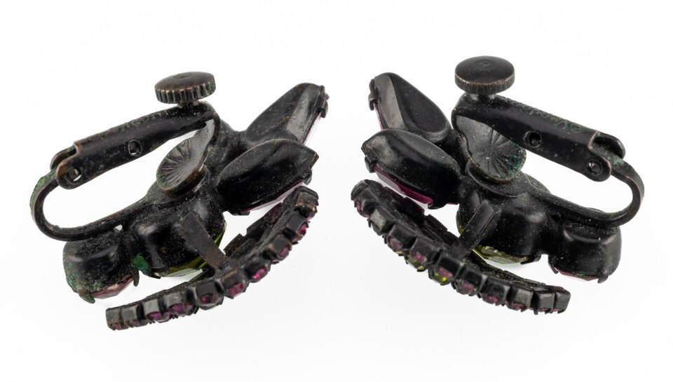 Vendome Pink and Green Rhinestone Jewelry Set in Black Metal Brooch and Earrings
