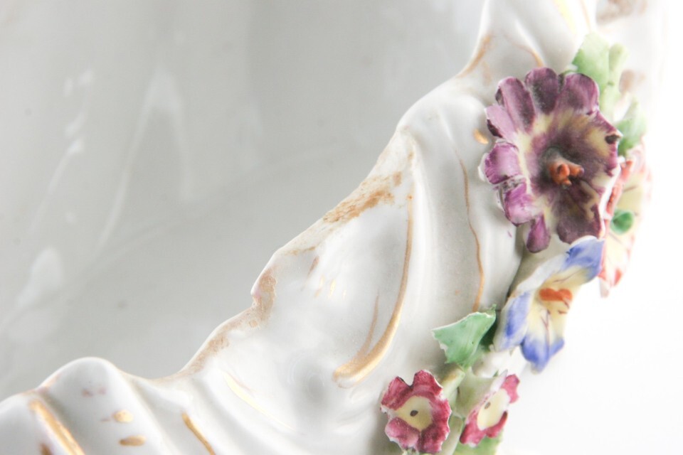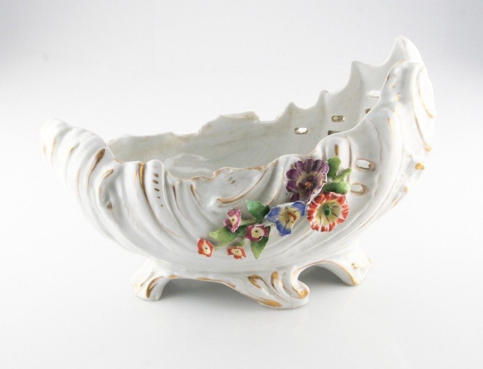 Vintage Deutsche Porzellanblumenschale mit "Deutschland" mit von Schierholz Blue Stamp. Weiß glasierte, goldene Trim Multicolor gemalt Blumen
