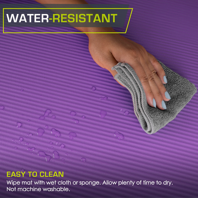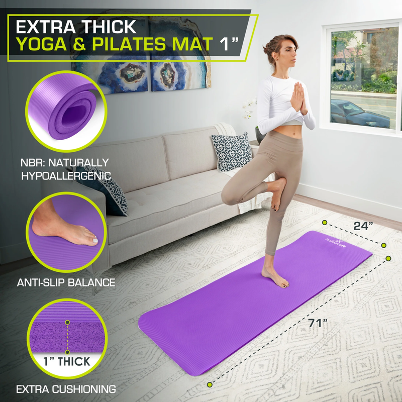 Extra Thick Yoga and Pilates Mat 1-in, Purple ULTRA COMFORT FOAM ? High density 1? (25mm) foam guarantees extra protection for sensitive joints to ensure superior comfort during workouts VERSATILE ? Ideal for many fitness purposes, such as Pilates yoga, the extra-large 71?L x 24?W mat fits any user WATER-RESISTANT ? NBR naturally repels moisture for low-maintenance; Wipe with wet cloth/sponge to clean, air dry NON-SLIP ? A non-slip surface adheres to the floor; the ribbed design provides grip and stability for a safe practice CARRYING STRAP ? Includes a FREE convenient mat sling for easy carrying; Limited lifetime warranty also included