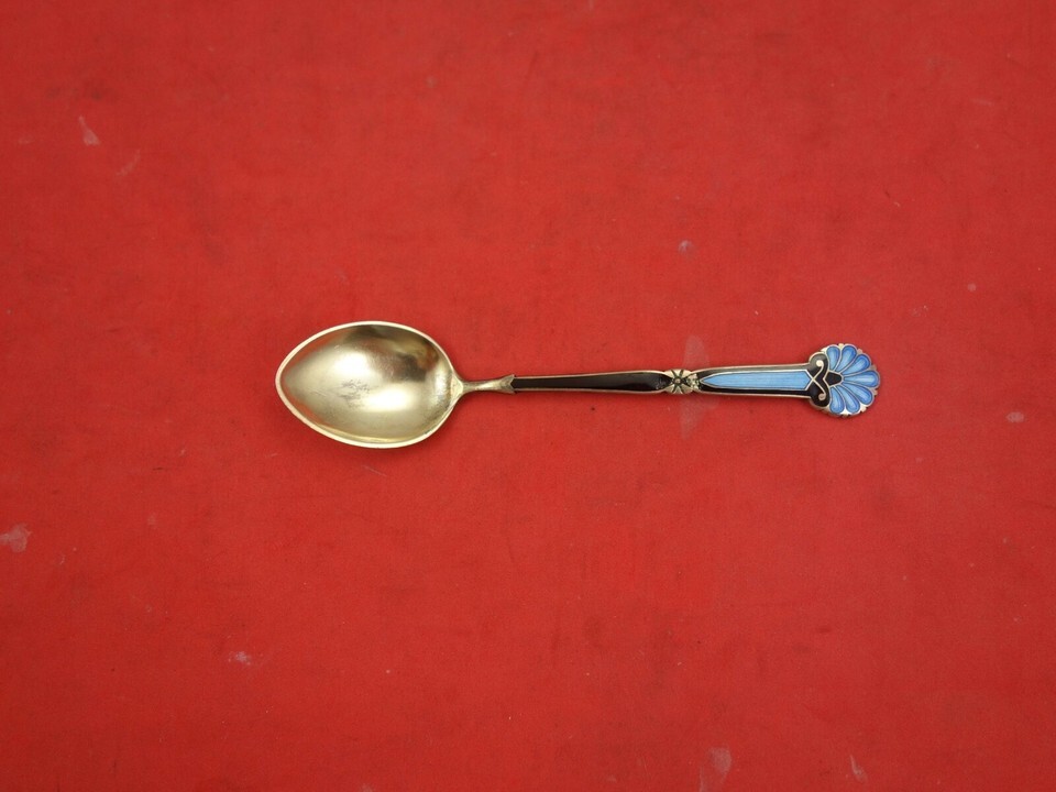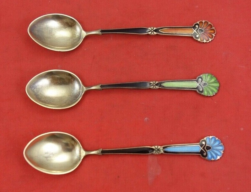 Norwegian sterling silver Demitasse Spoon set of 3 vermeil, enameled red, green and blue, 3 7/8" (maker unknown). It is not monogrammed and is in excellent condition.