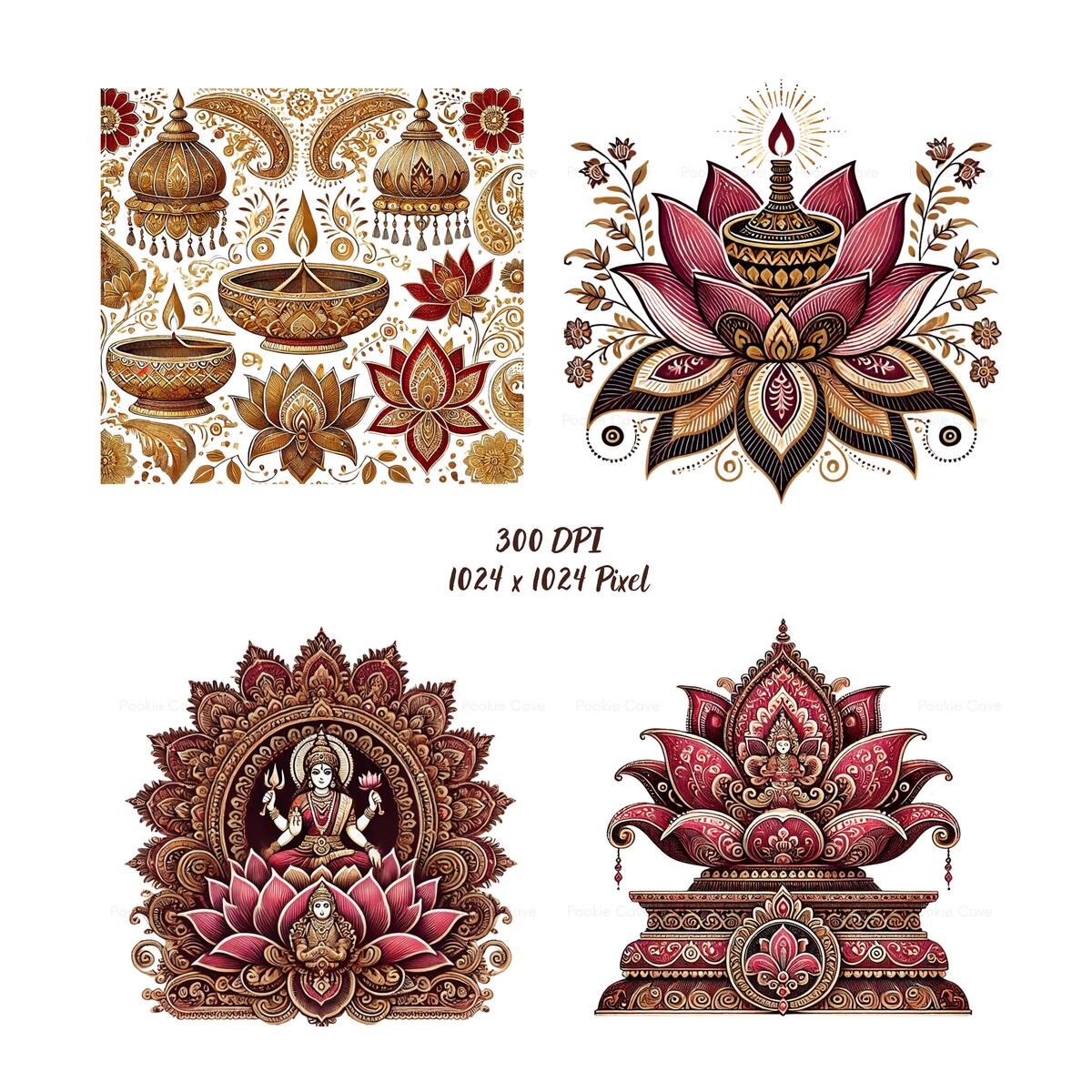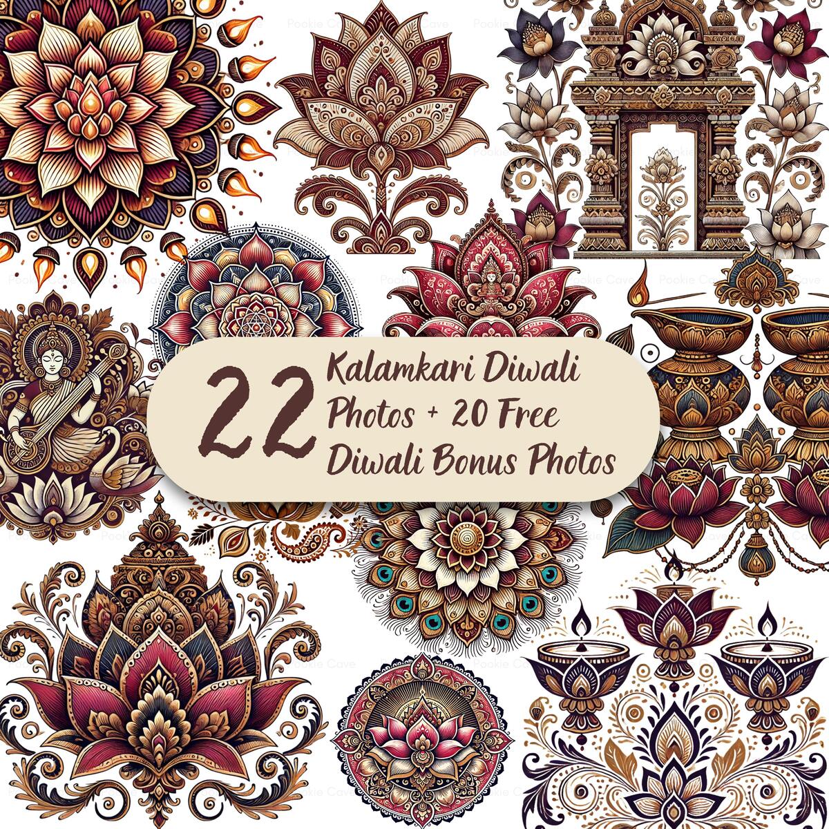 22 Kalamkari Diwali Clipart Set | Indian Folk Art Lotus, Diya, Mandala & Paisley