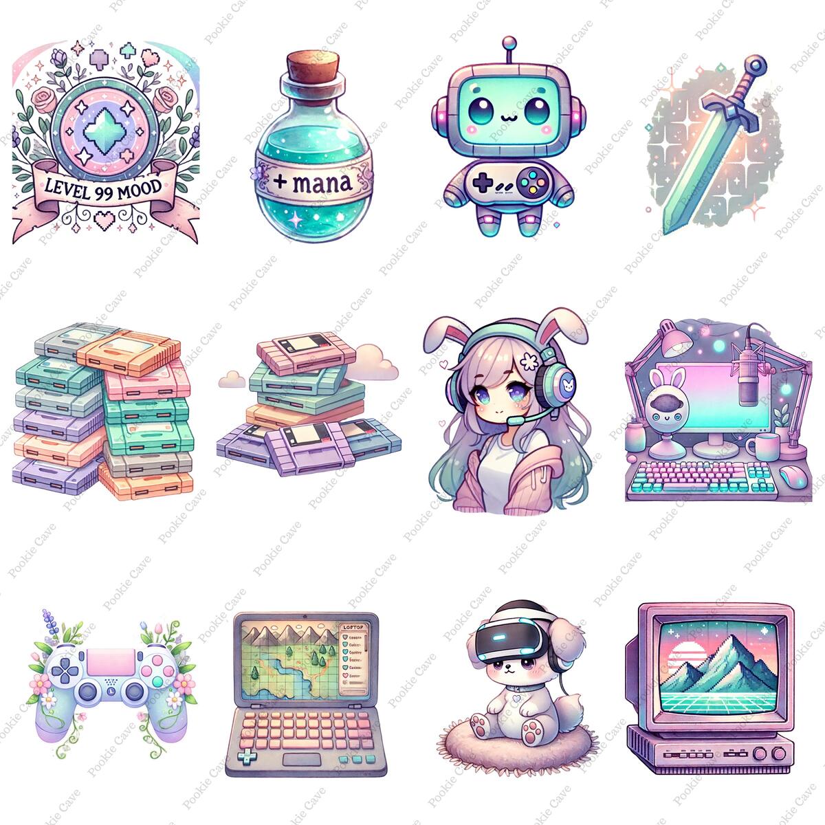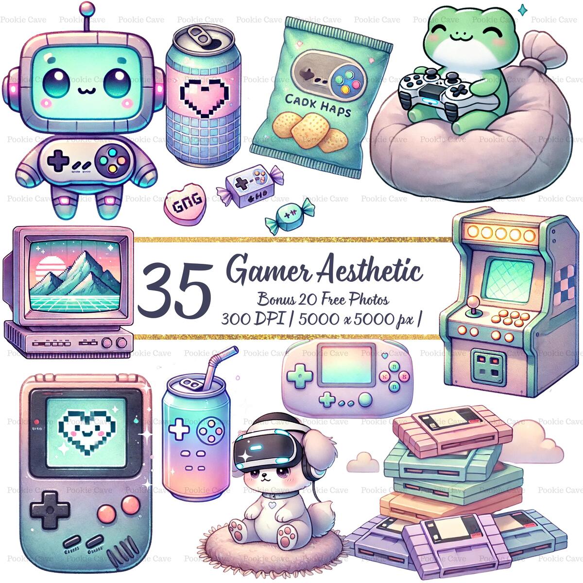 Level up your creativity with this 35 Gamer Aesthetic Watercolor Clipart Bundle — a dreamy collection inspired by cozy gaming spaces and nostalgic setups.