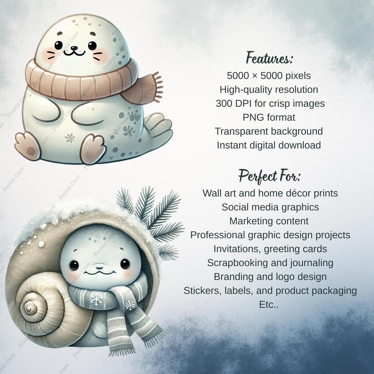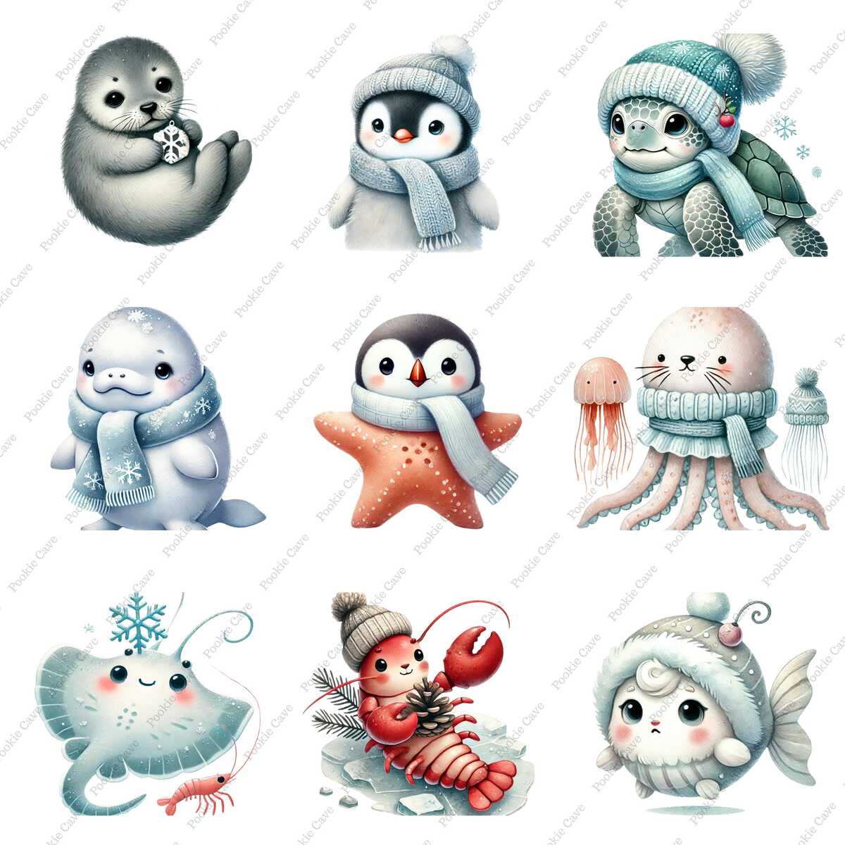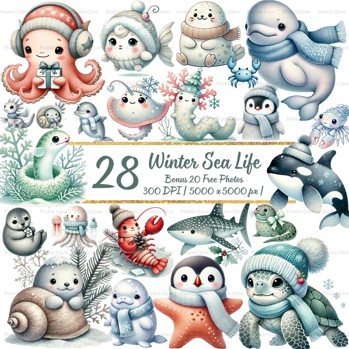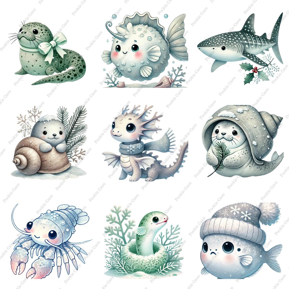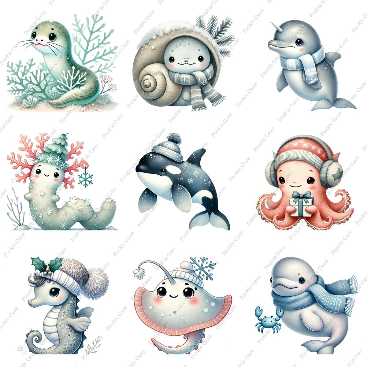 Winter Sea Life Clipart – 28 Baby Ocean Animals, Watercolor PNG (Digital Downloa