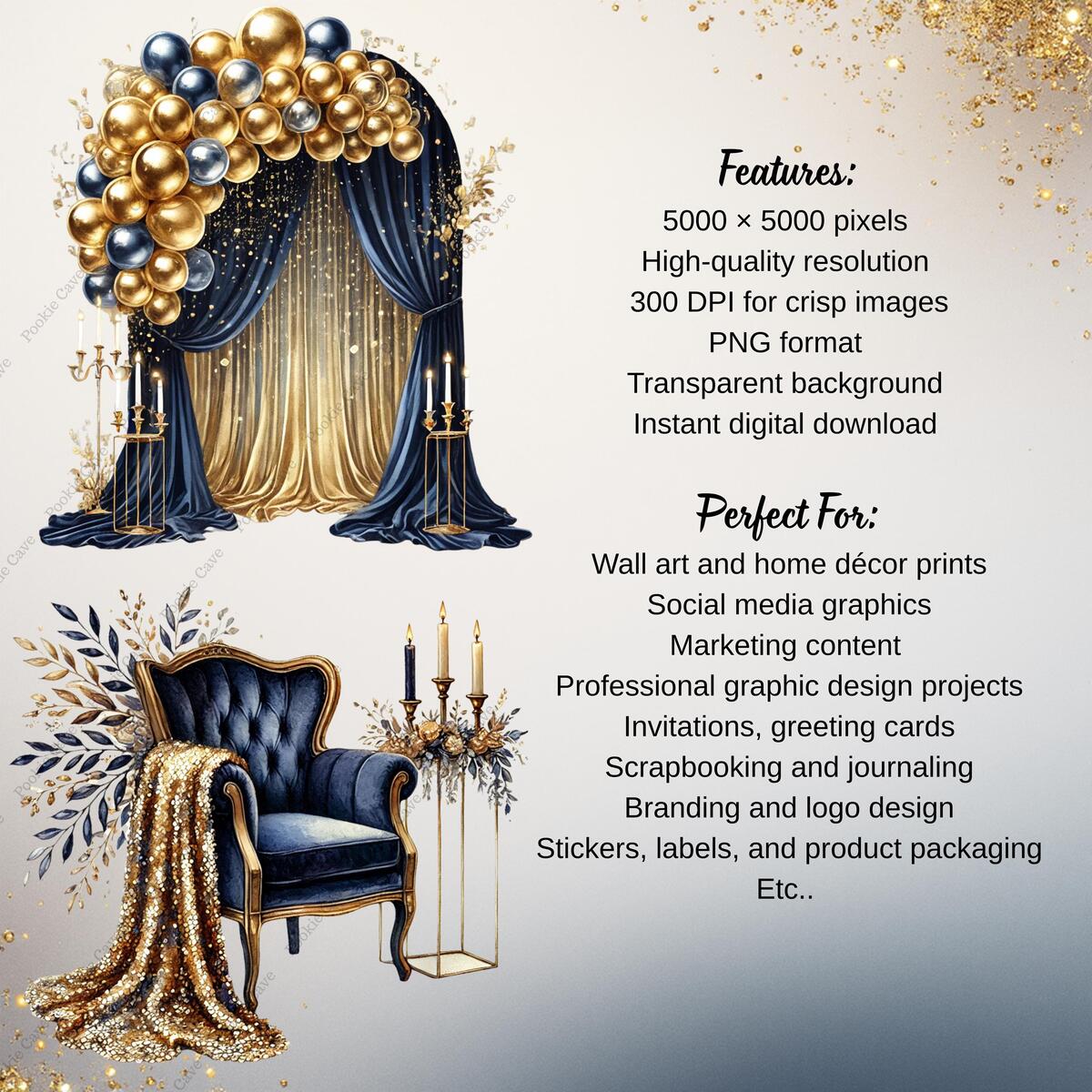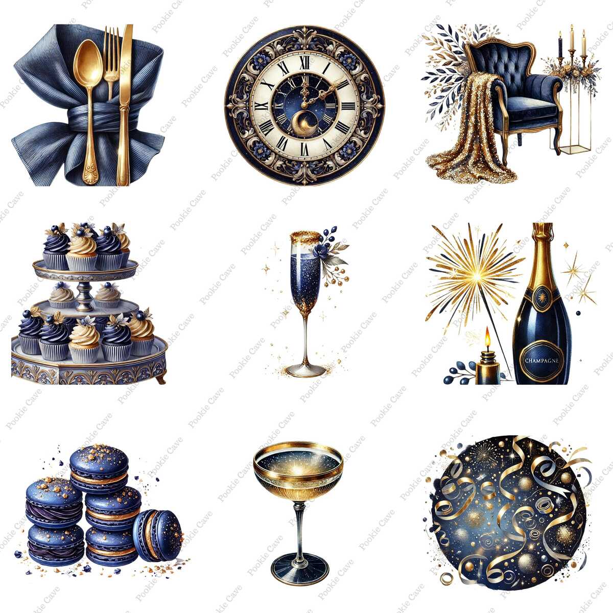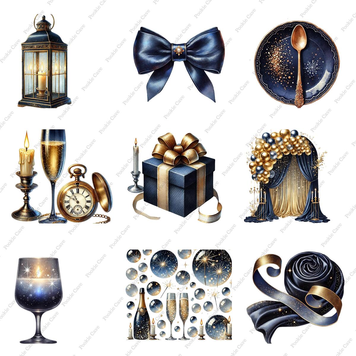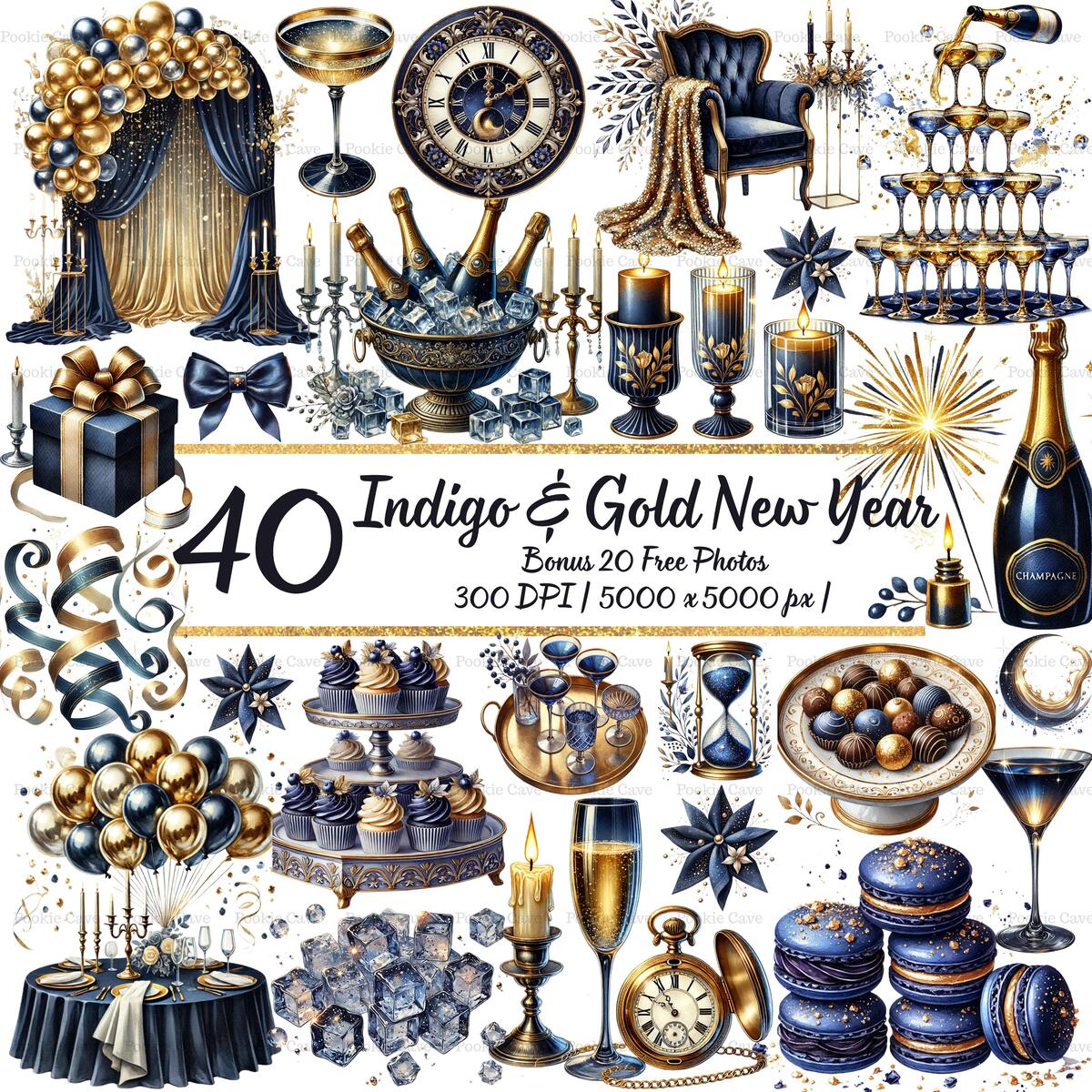 Ring in the New Year with elegance and shimmer! This exclusive set of 40 watercolor clipart PNGs blends indigo with gold accents, perfect for creating luxurious New Year’s Eve invitations, party printables, social media posts, and digital decor.