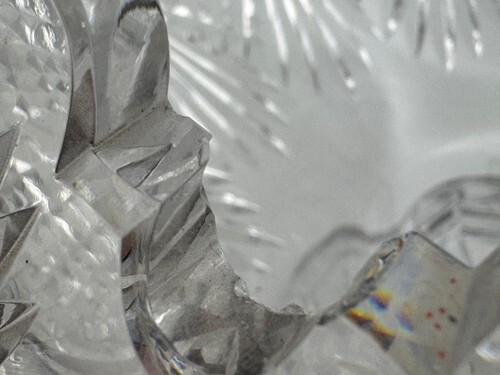 This centerpiece bowl measures 7 3/4" in height and 7 1/2" in diameter. It has several small chips on the inside of the rim (see pictures 9-12).