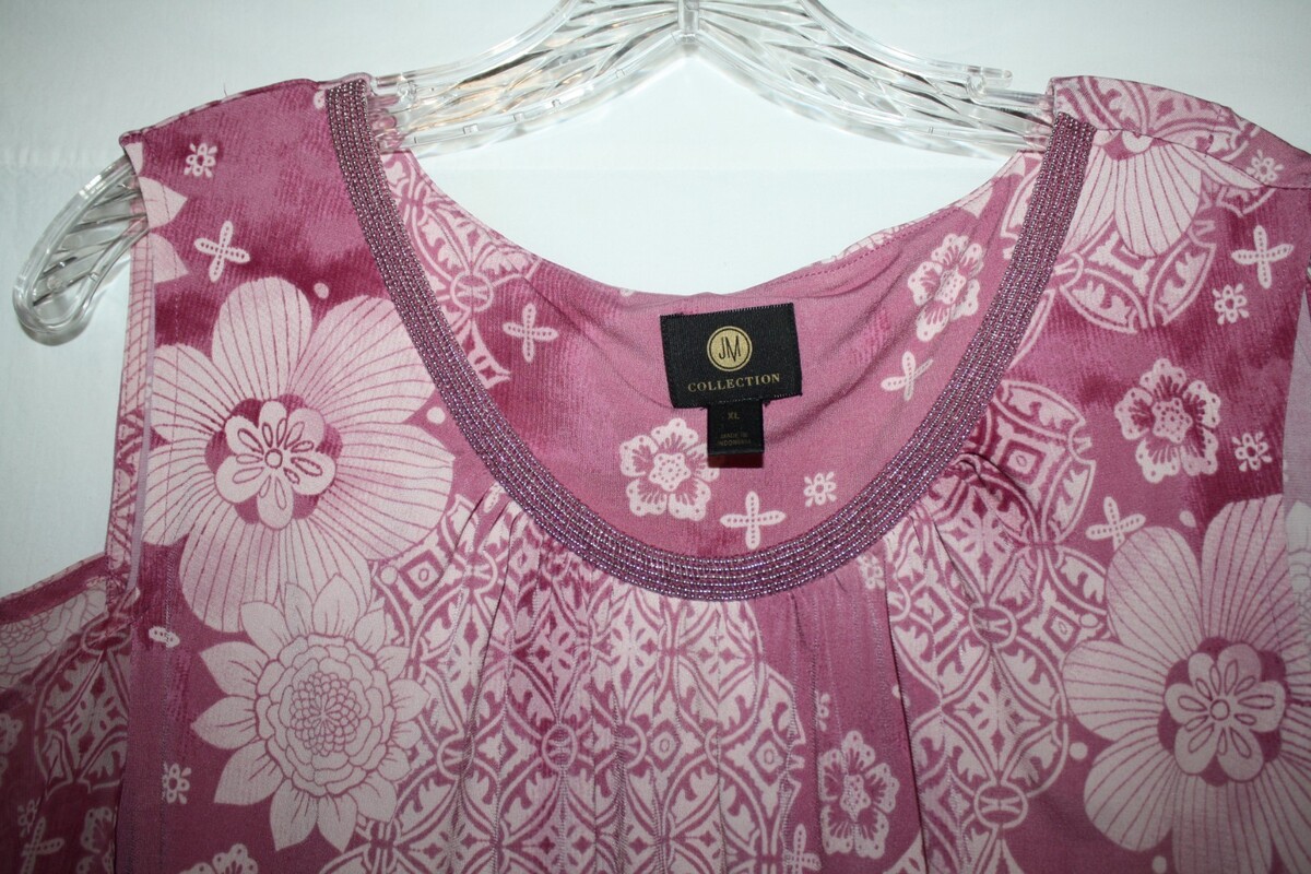 JM Collection WOMAN XL Pink Floral Blouse Cold Shoulder Top Beaded Round Neck