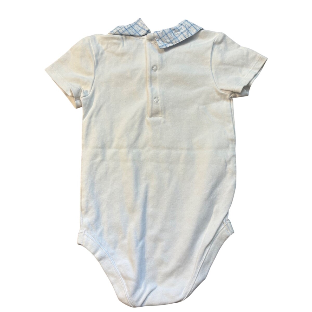 Soft and breathable bodysuit featuring a playful helicopter design and a stylish blue plaid collar. Ideal for comfort and adorable style.