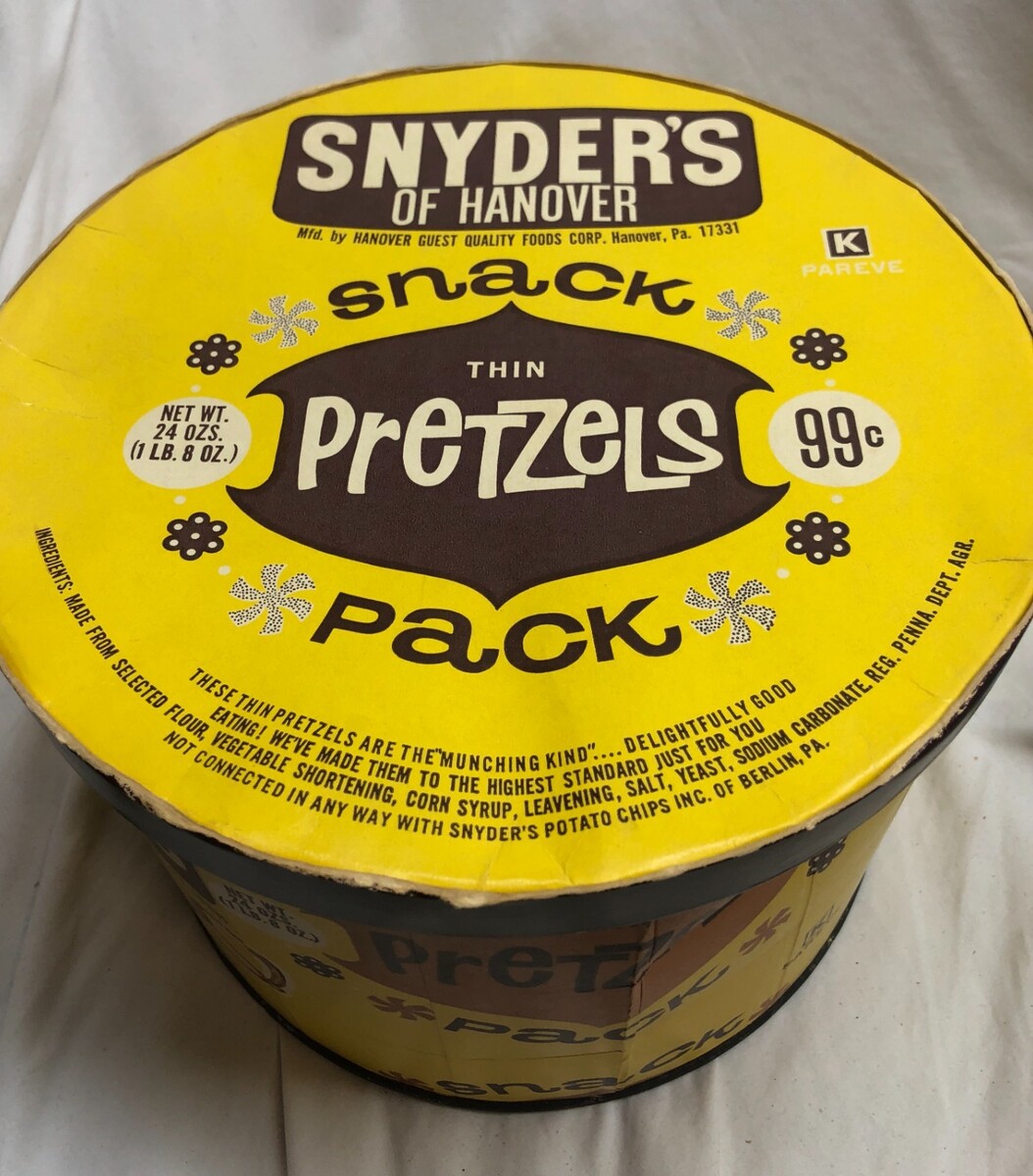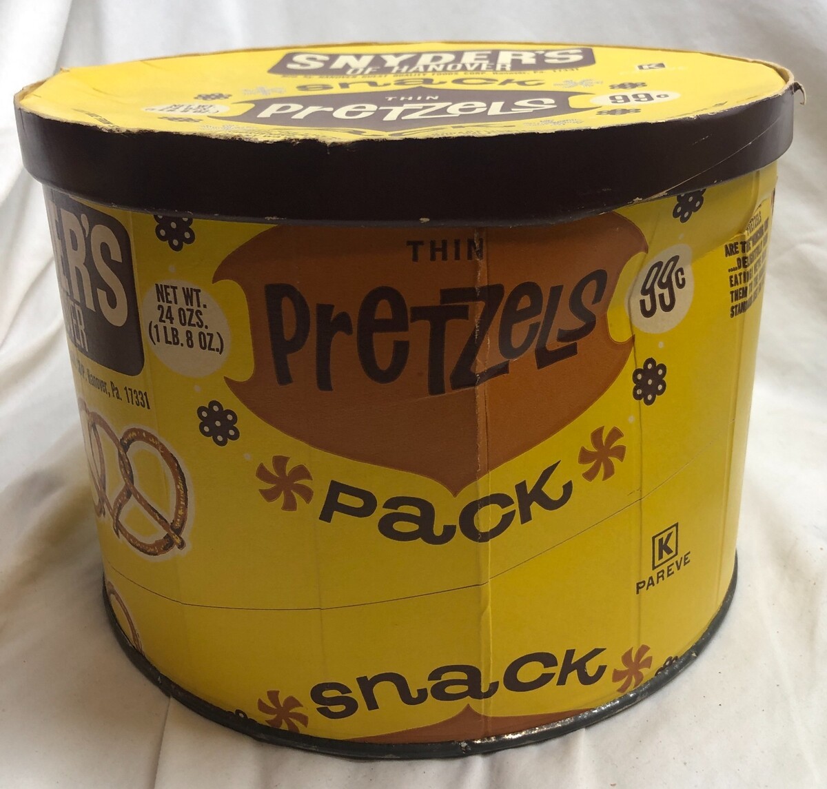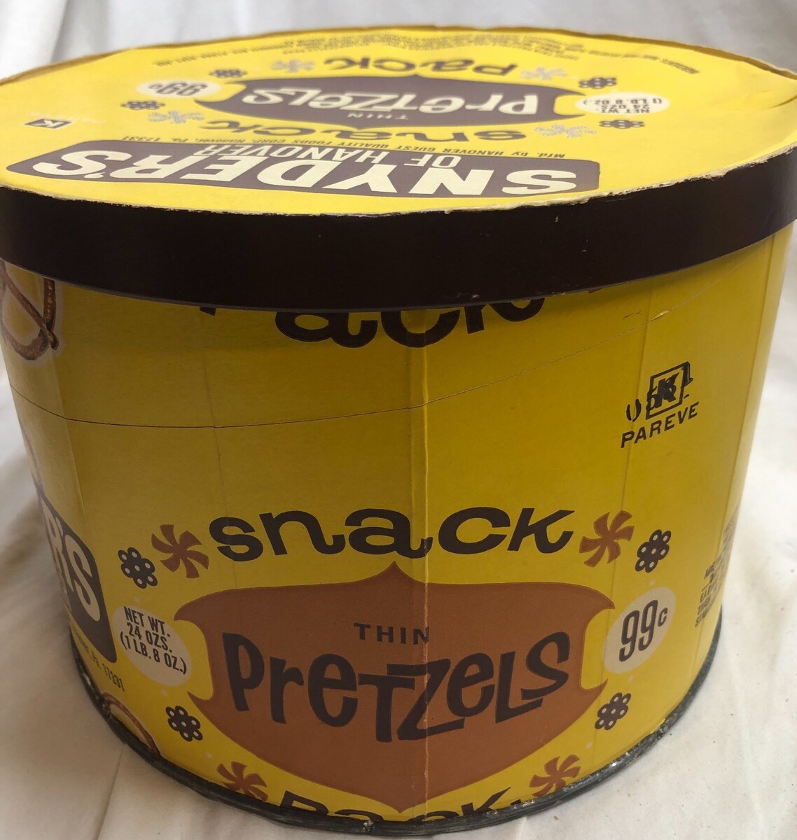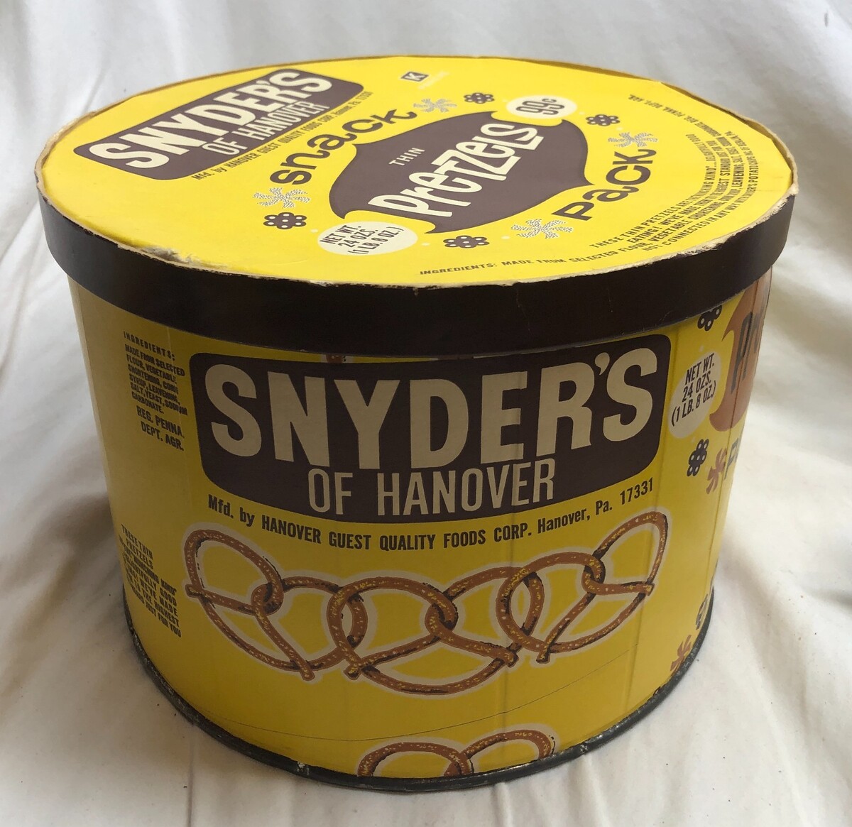 Antique SNYDER'S OF HANOVER Pretzels Paper Cardboard Container with Metal Rim
